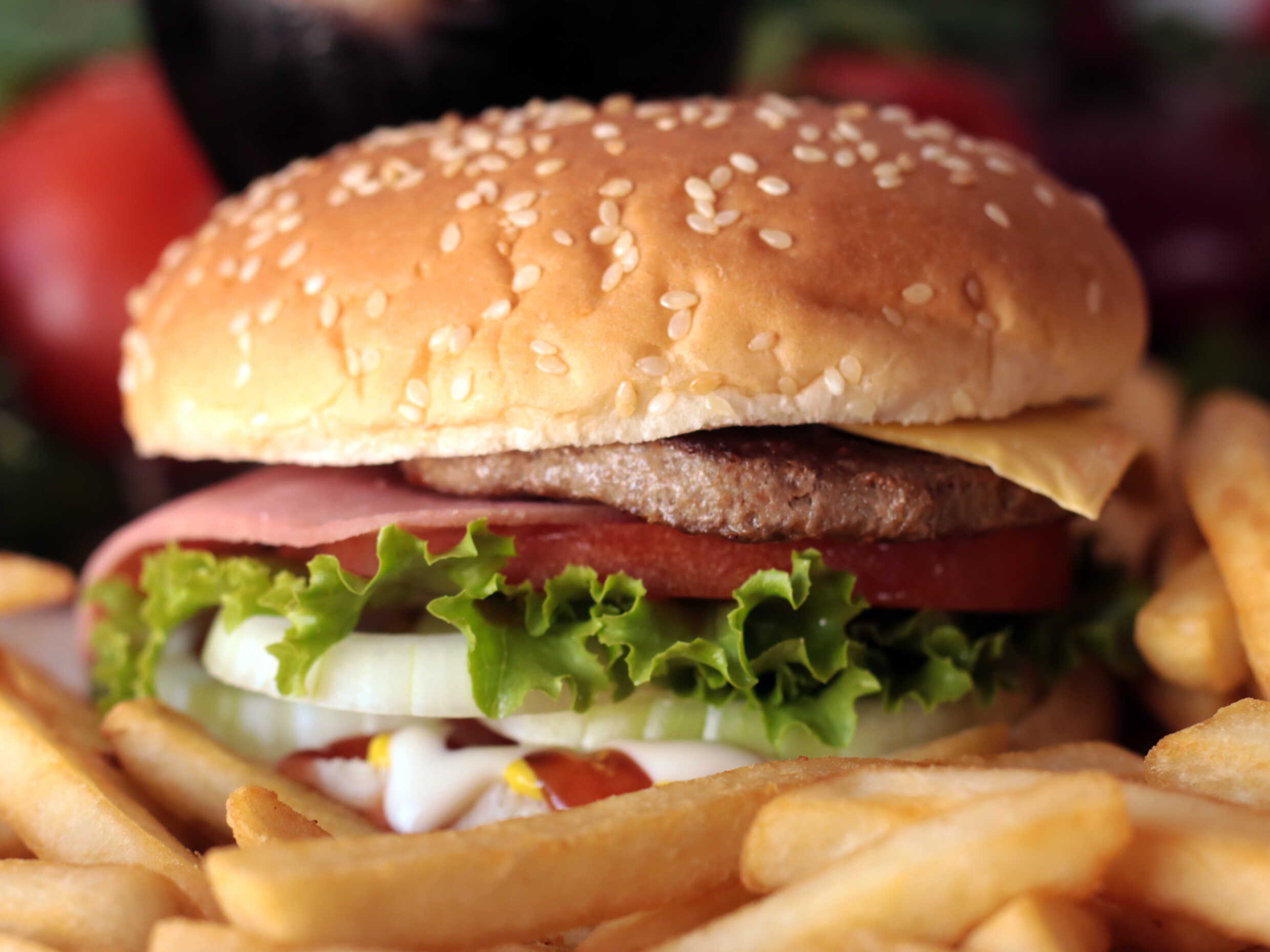 Hamburguesa con torta de carne, lechuga, cebolla, tomate, jamón y queso.