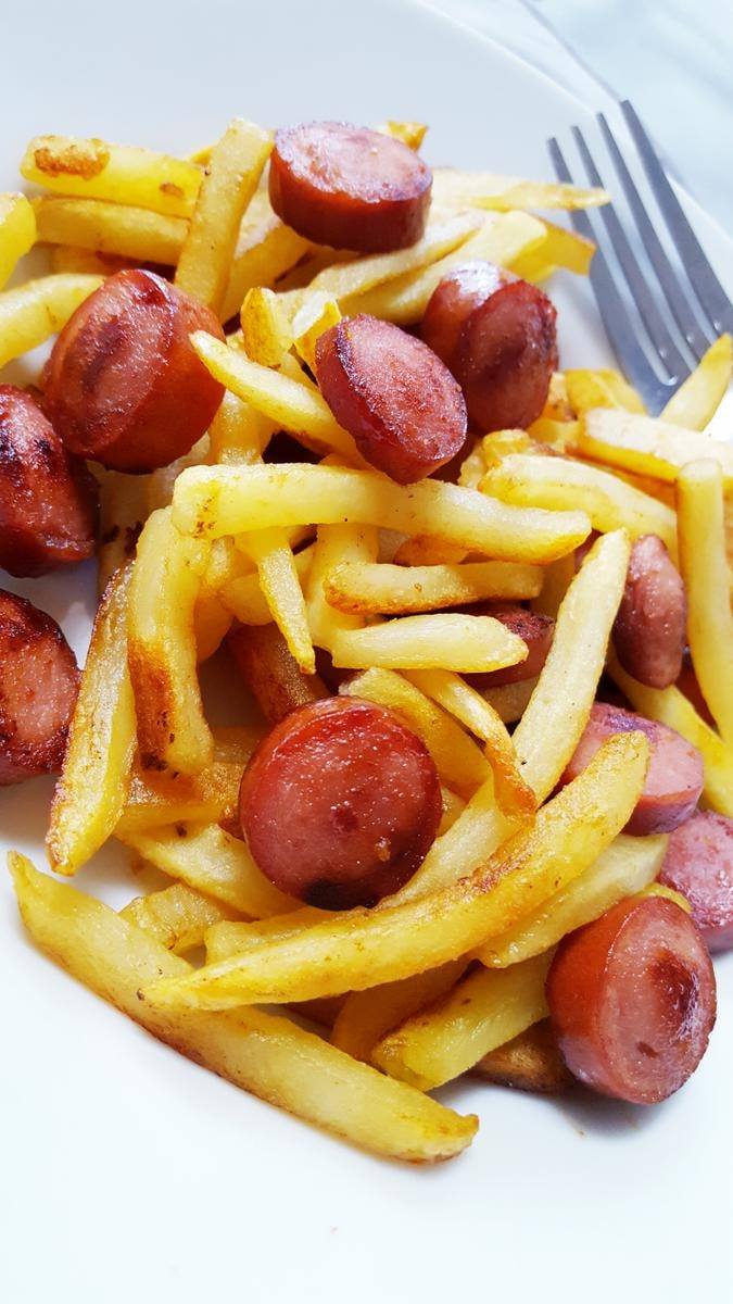 Papas fritas con salchichas, salsa de tomate y mayonesa.