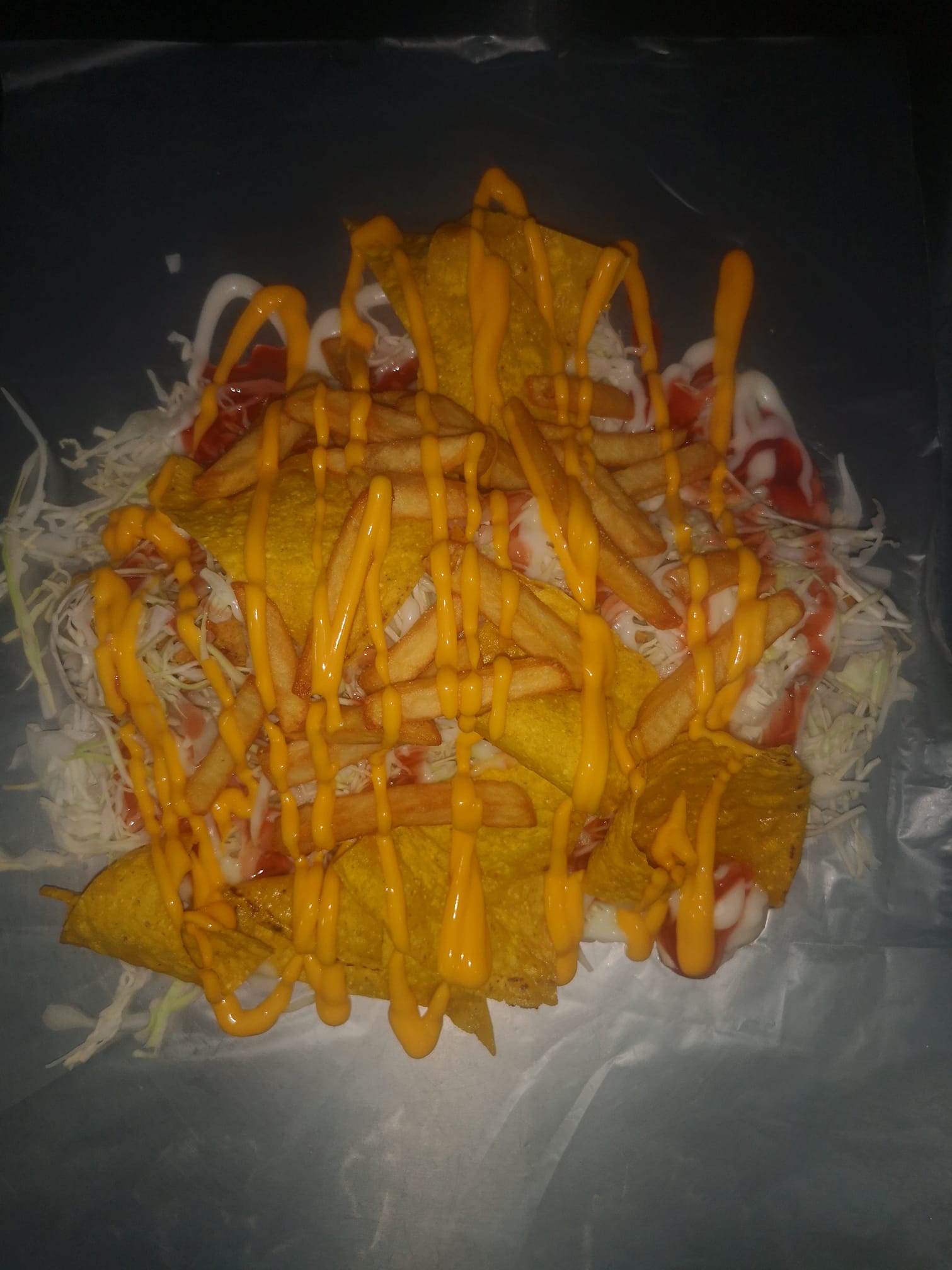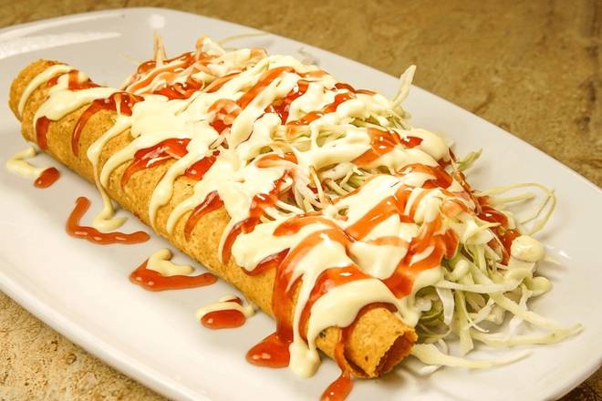 Taco grande con repollo, salsa de tomate y mayonesa, papas fritas, doraditas y queso cheddar.