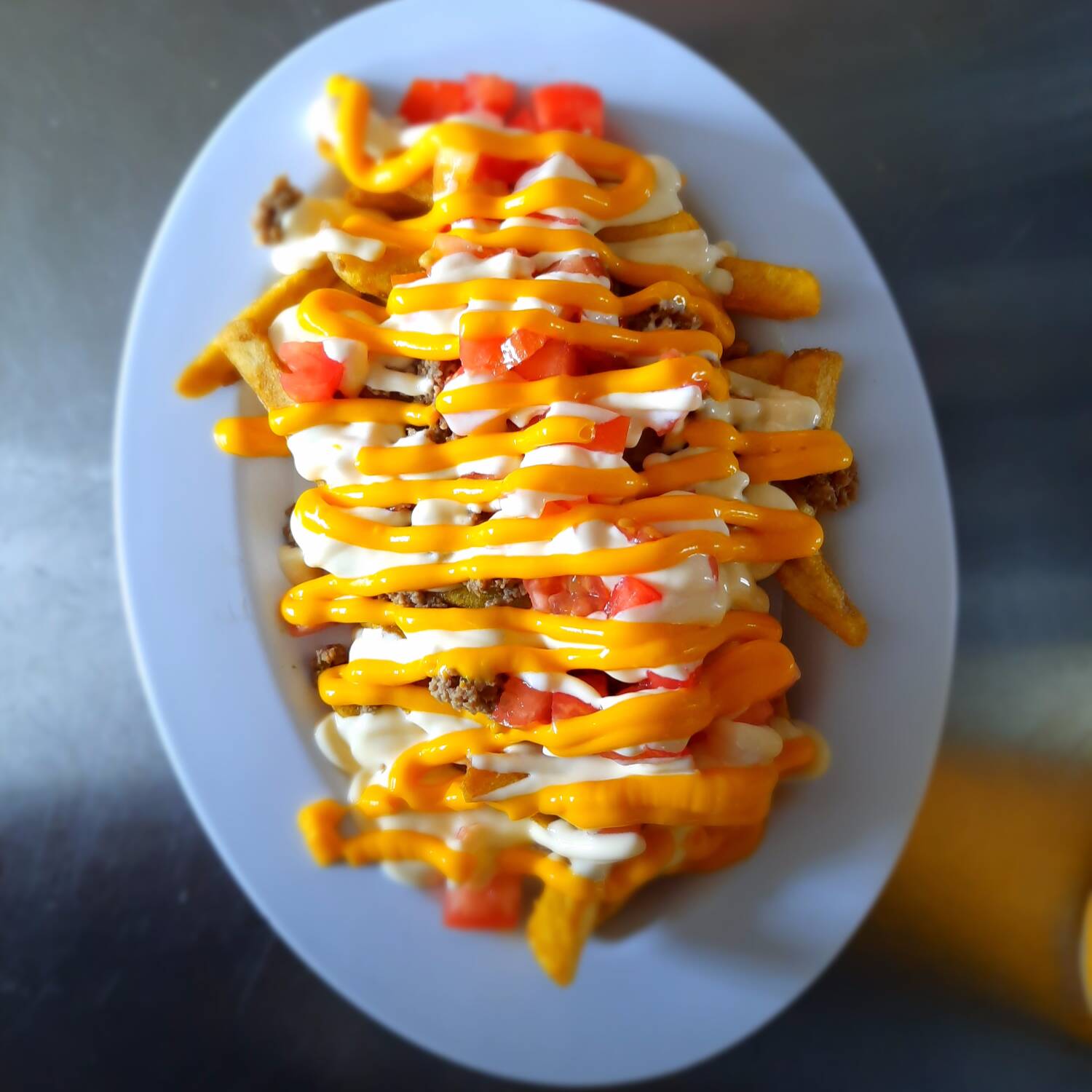 Papas fritas con carne mechada, queso cheddar, natilla y tomate picado.