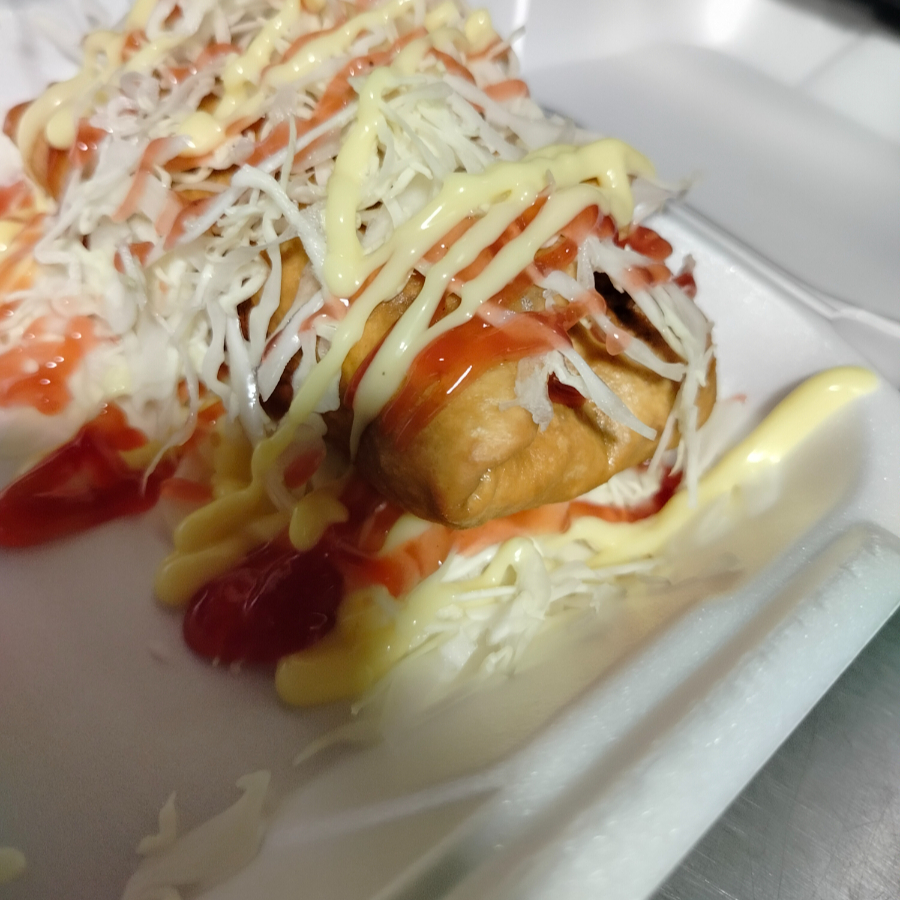 Canelón relleno de carne envuelto en harina, acompañado de repollo, salsa de tomate y mayonesa.