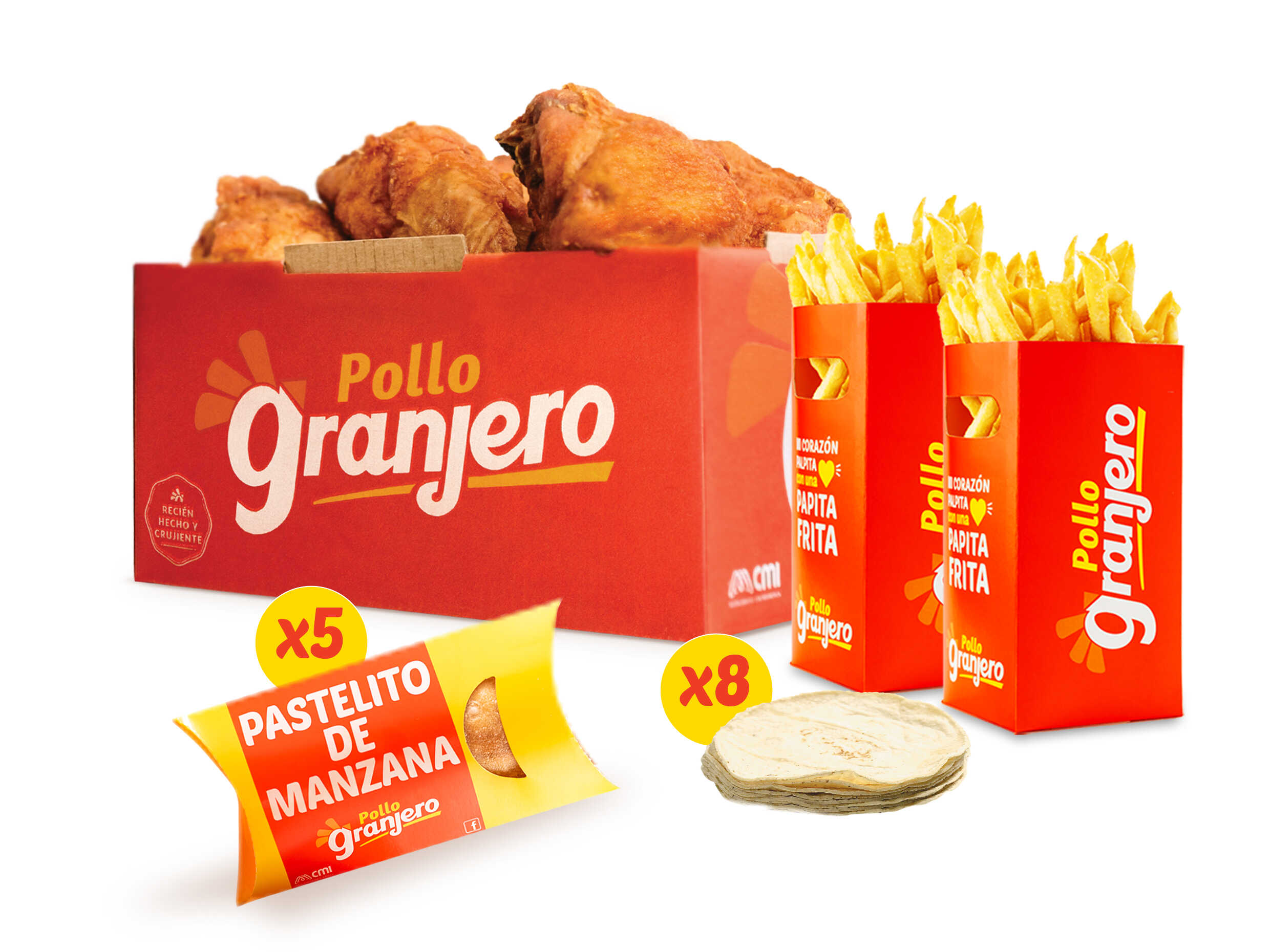 Banquete de 10 Piezas (3 cuartos, 3 muslos, 2 alas y 2 pechugas) + 2 papas grandes + 8 tortillas y 5 pastelitos.