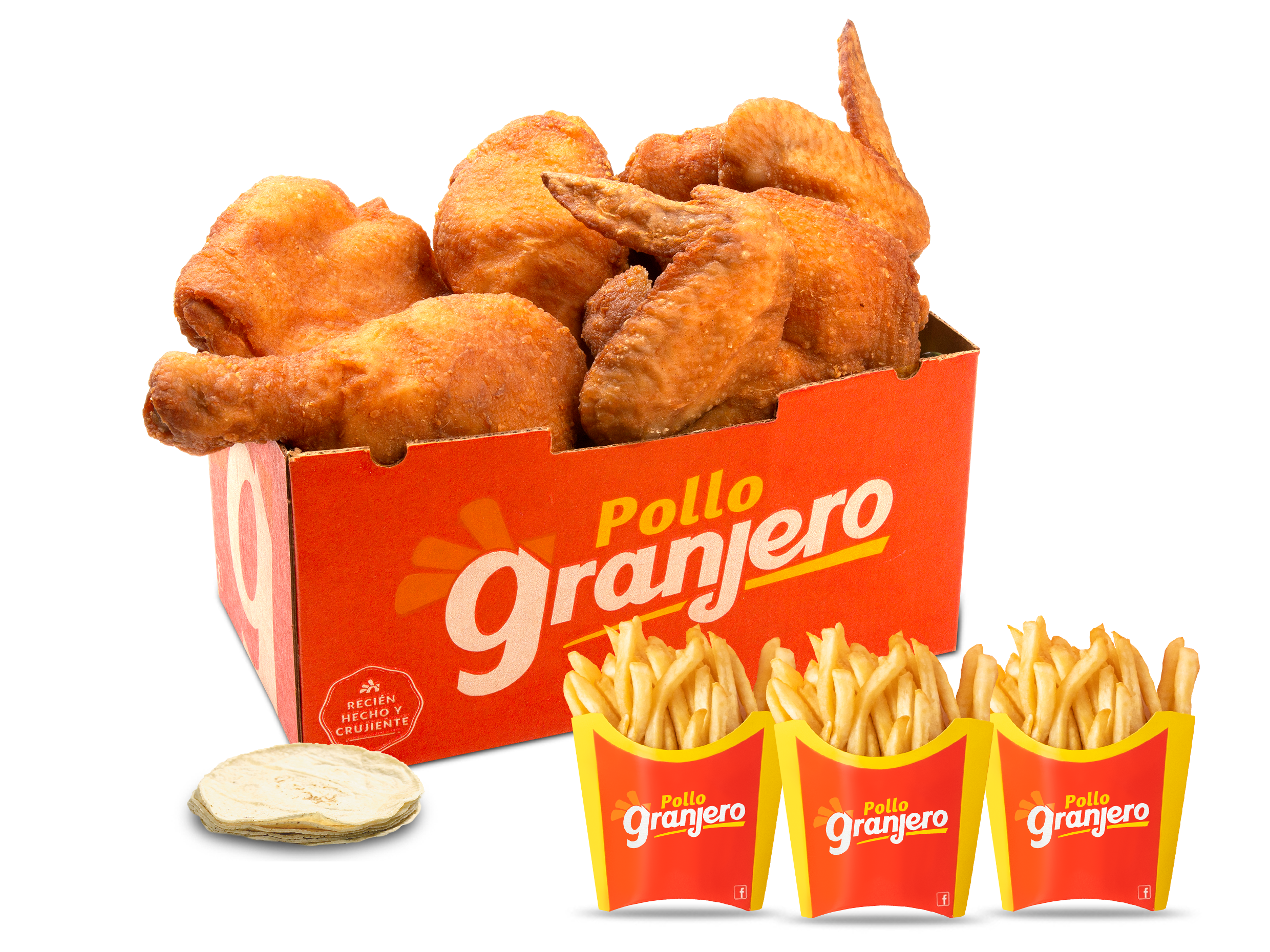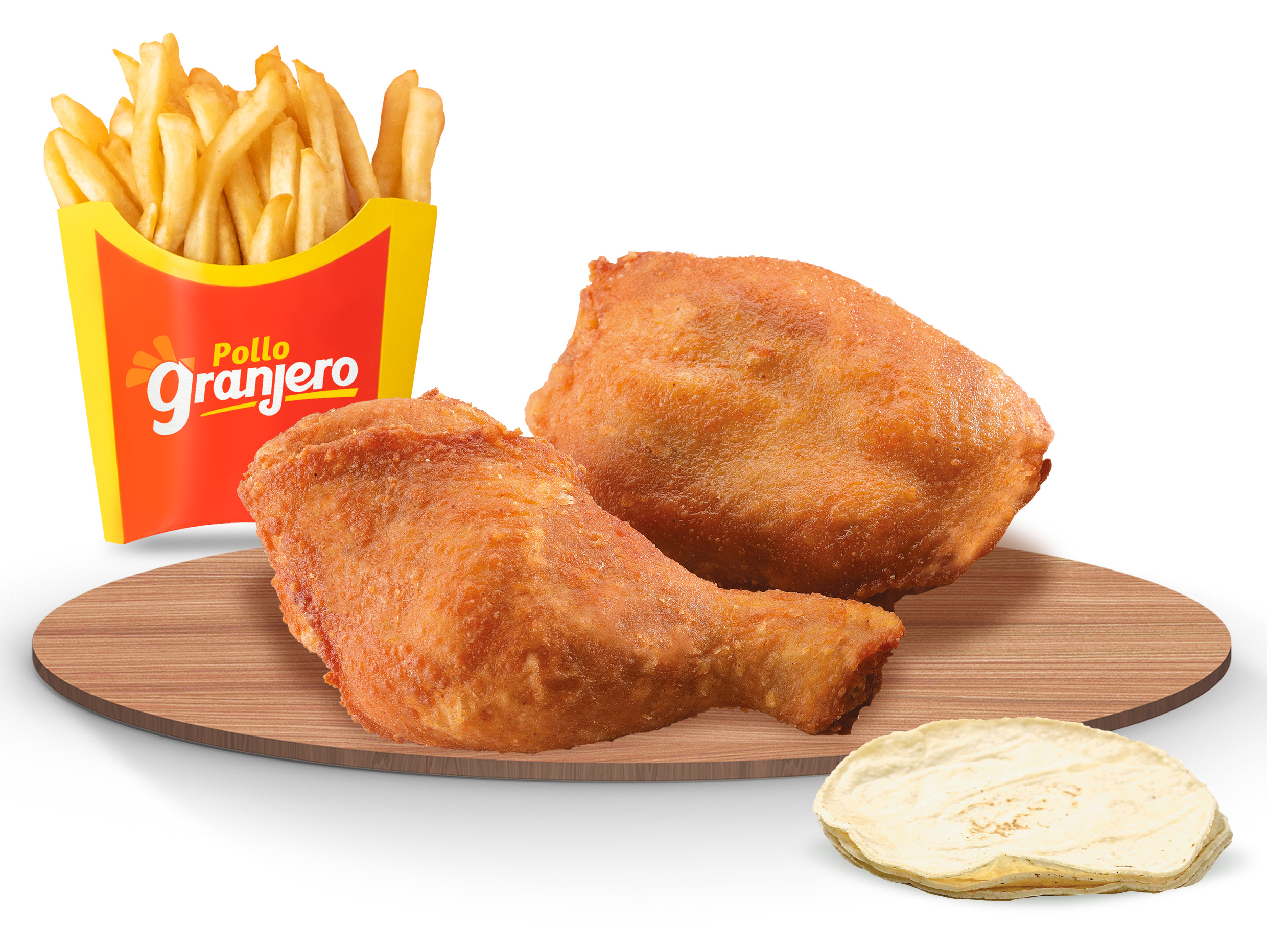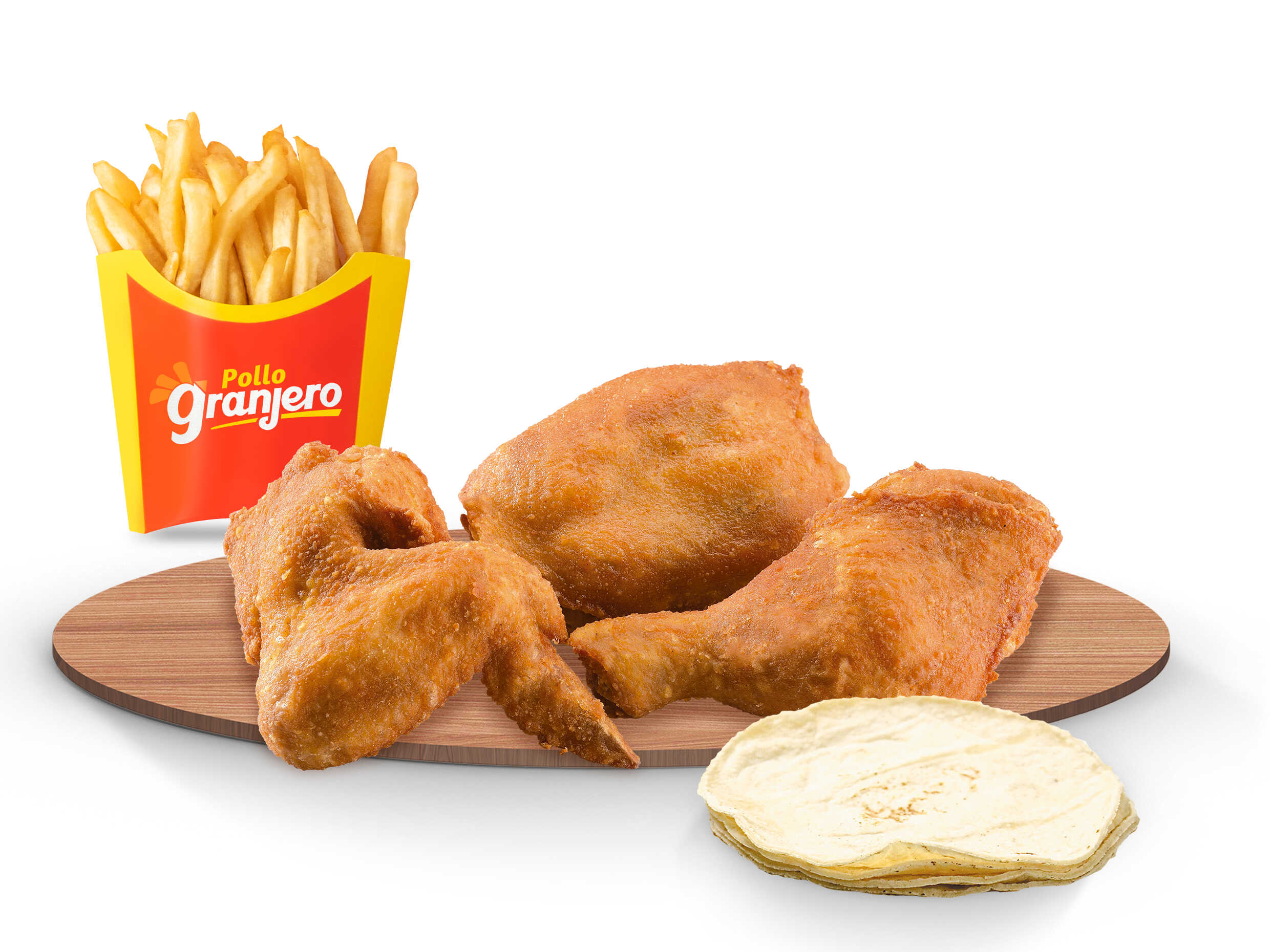 3 piezas (Cuarto, Muslo, Ala) + 1 papa + 2 tortillas