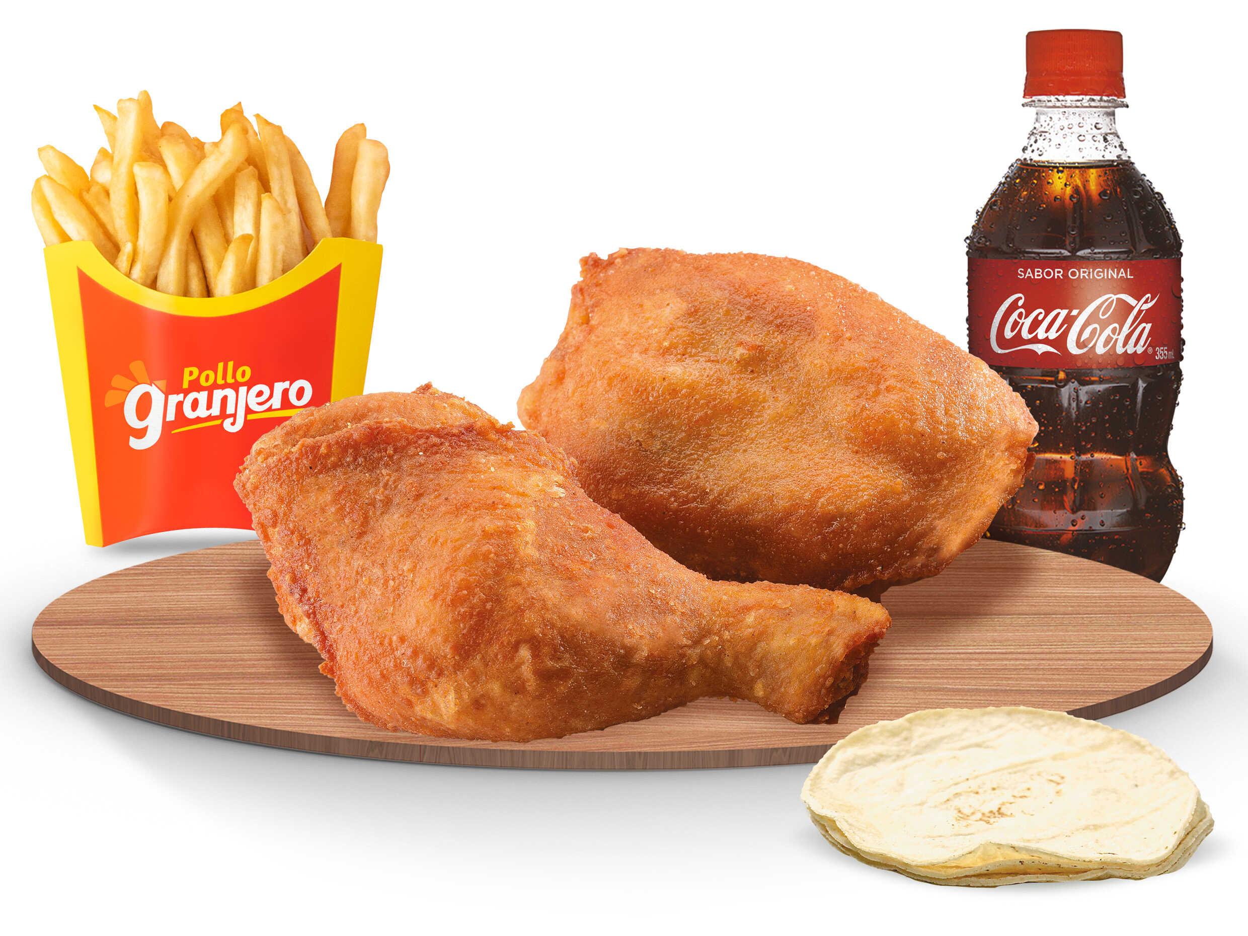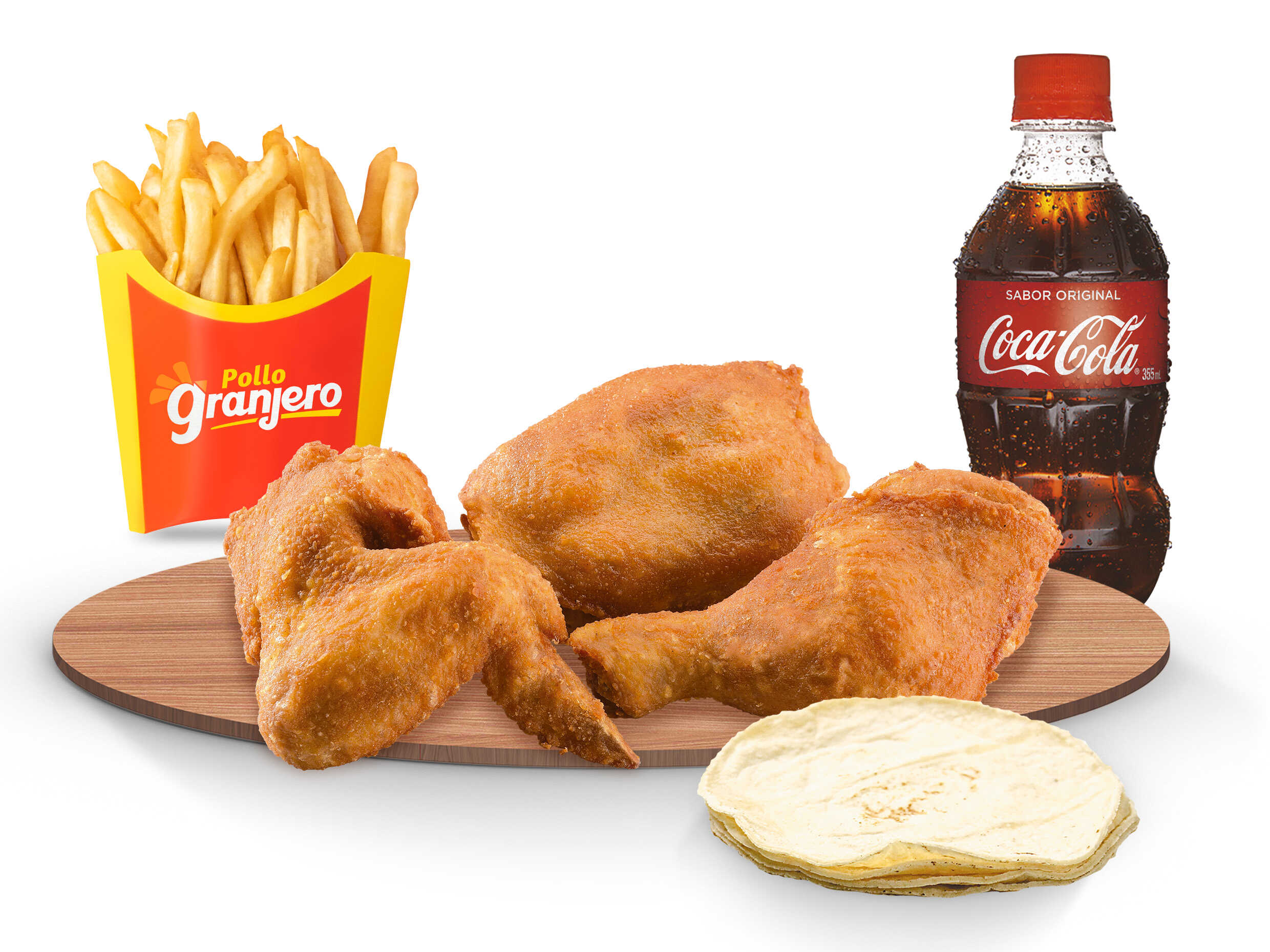 3 piezas (Cuarto, Muslo, Ala) + 1 papa + 2 tortillas + Coca Cola 355ml.