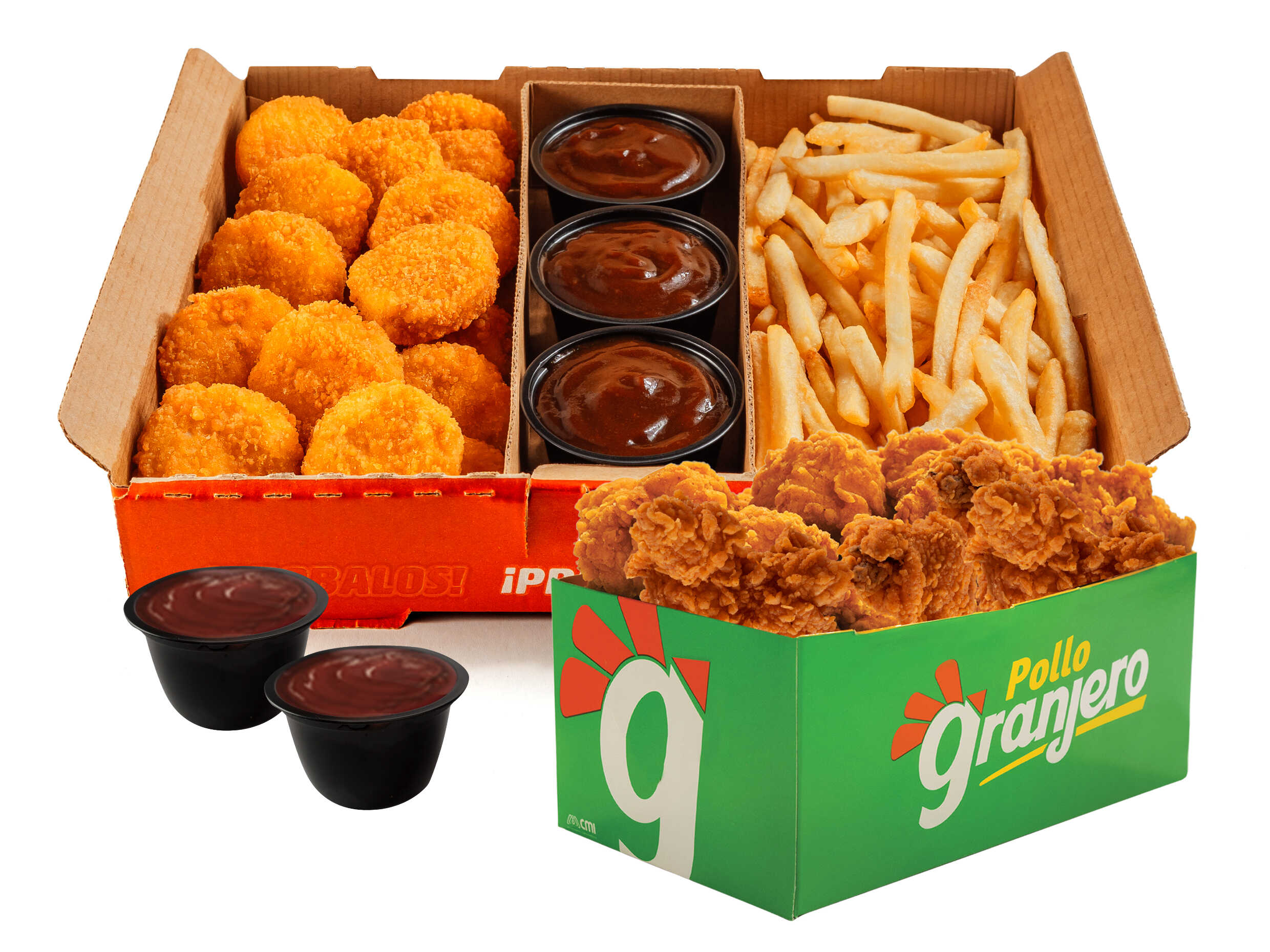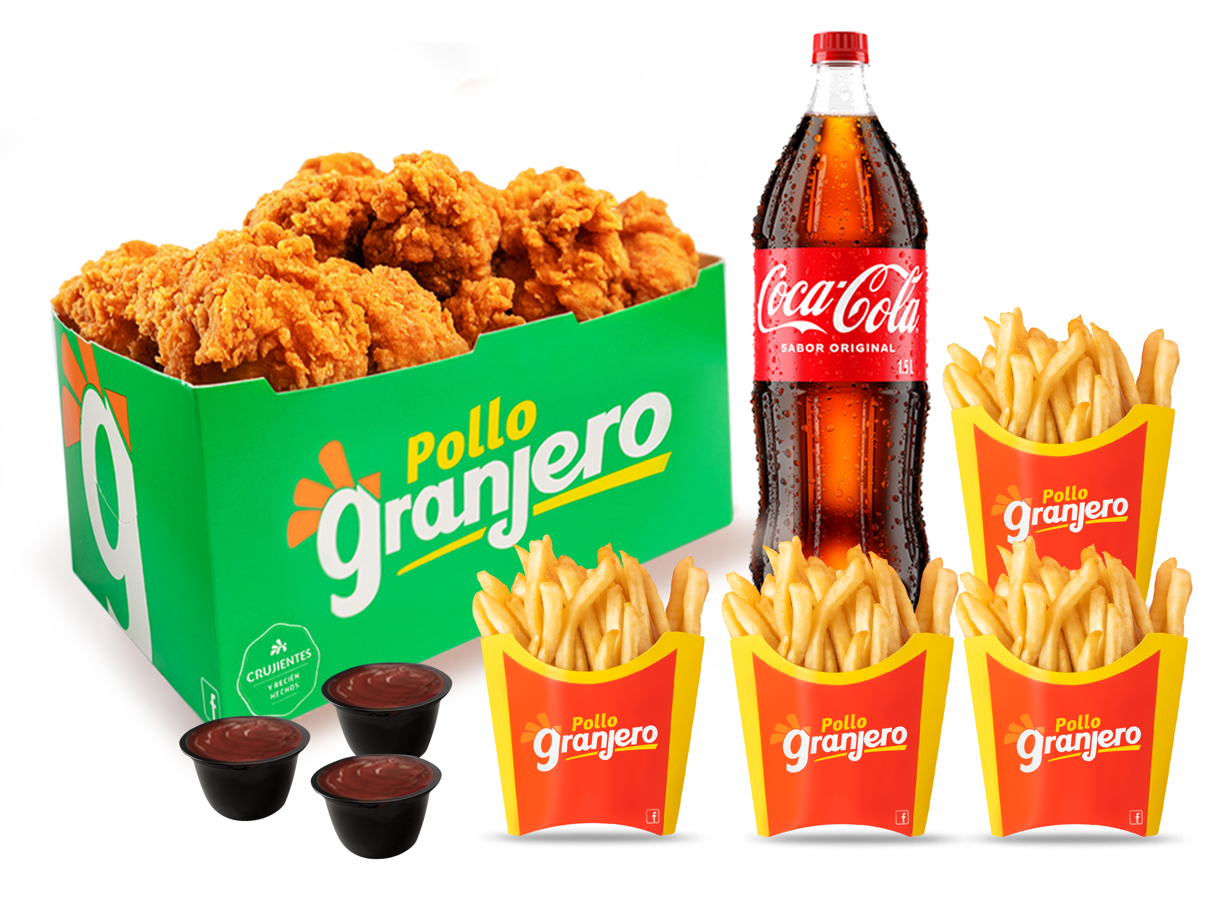 20 granjeritos + 3 Salsas Barbacoa + 4 papas pequeñas + Coca Cola 1,5L.