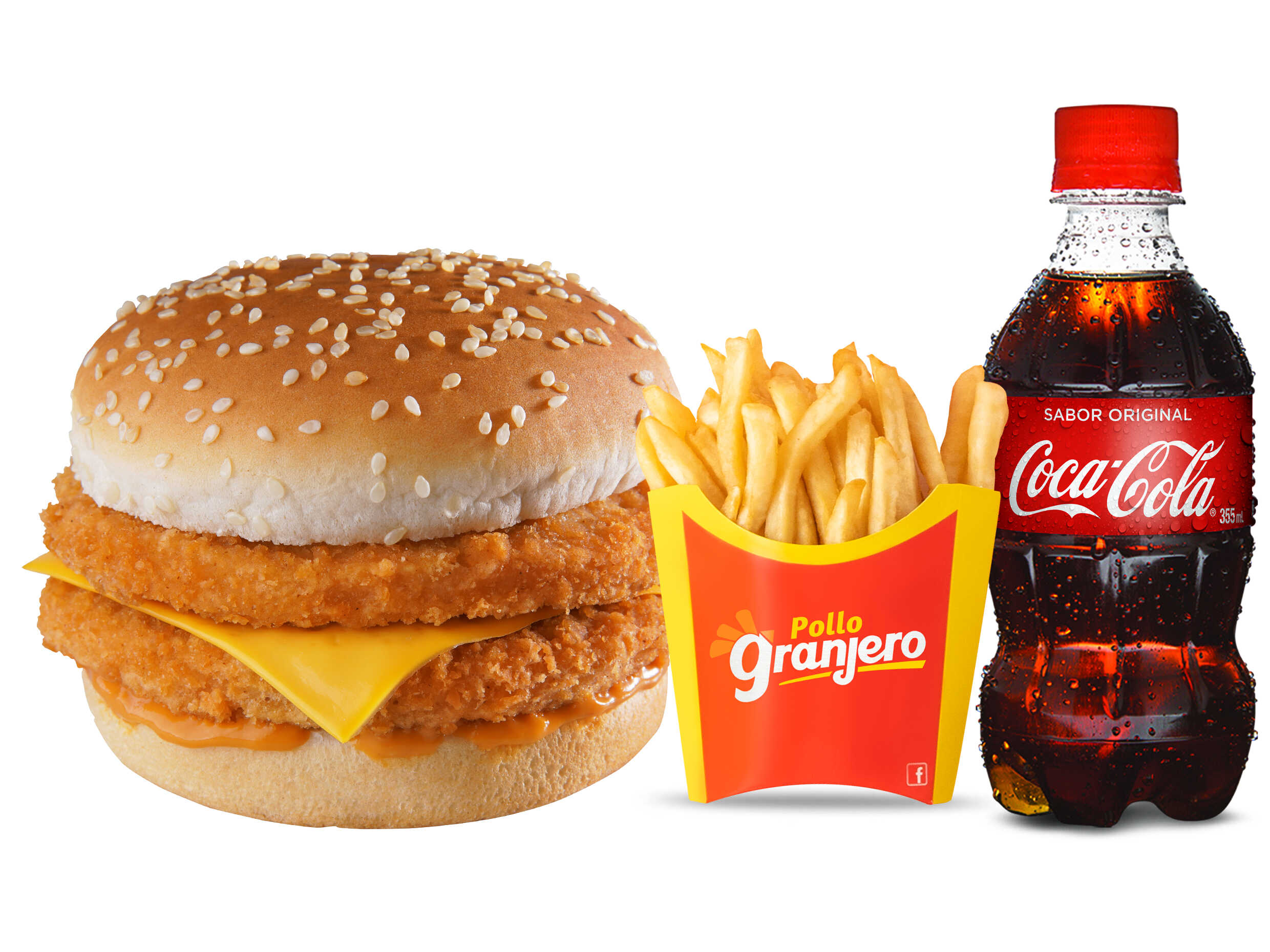 Disfruta 1 cuarto pollo, 1 hamburguesa con queso, papa pequeña y Coca Cola regular 355ML