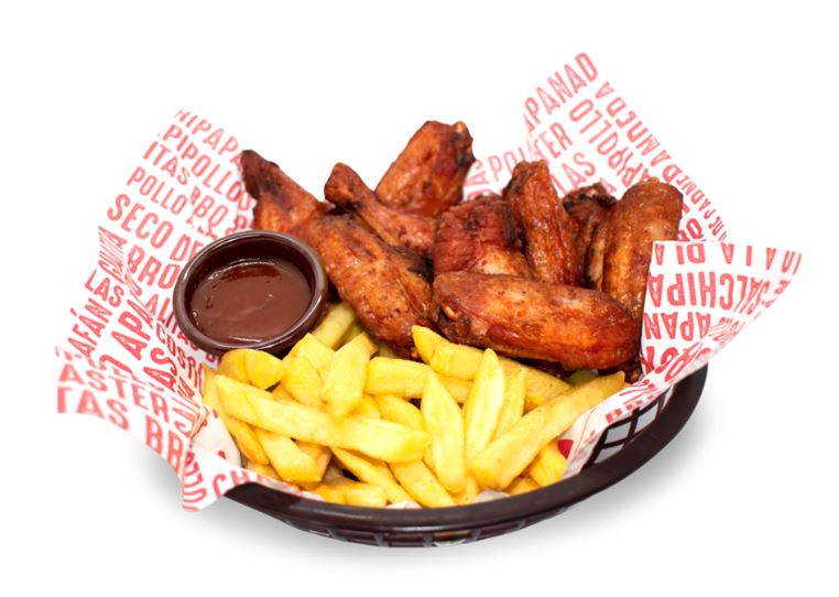 10 Deliciosas unidades de alitas chinas y crujientes, papas fritas.