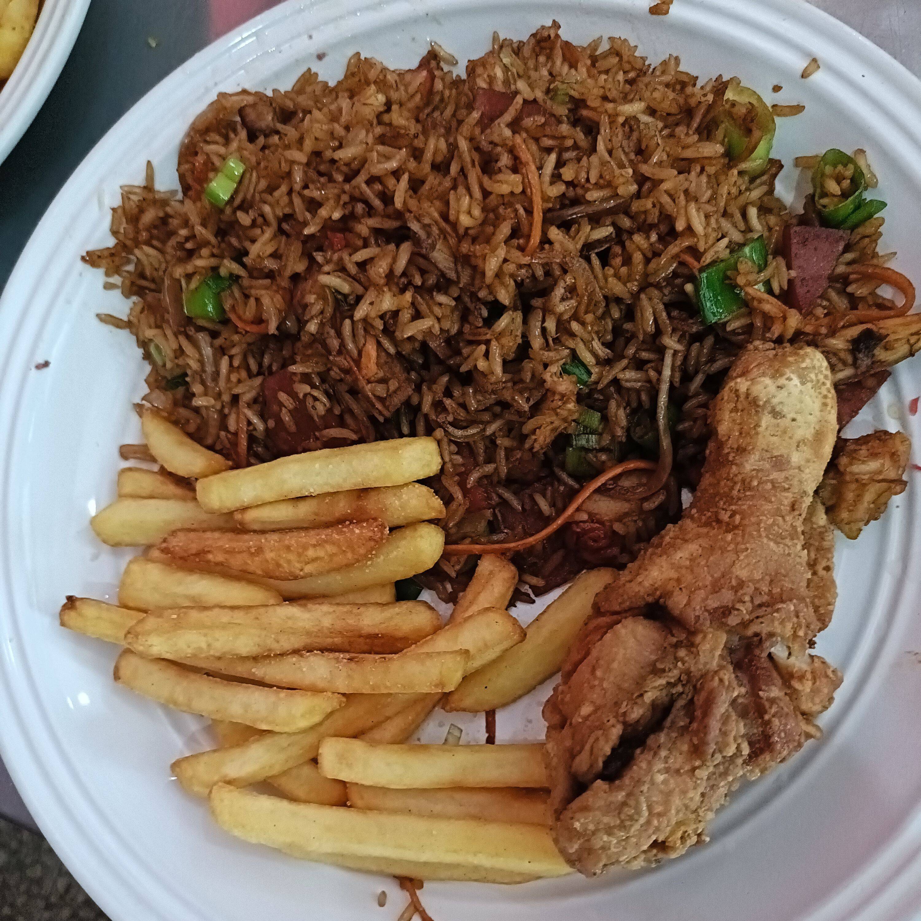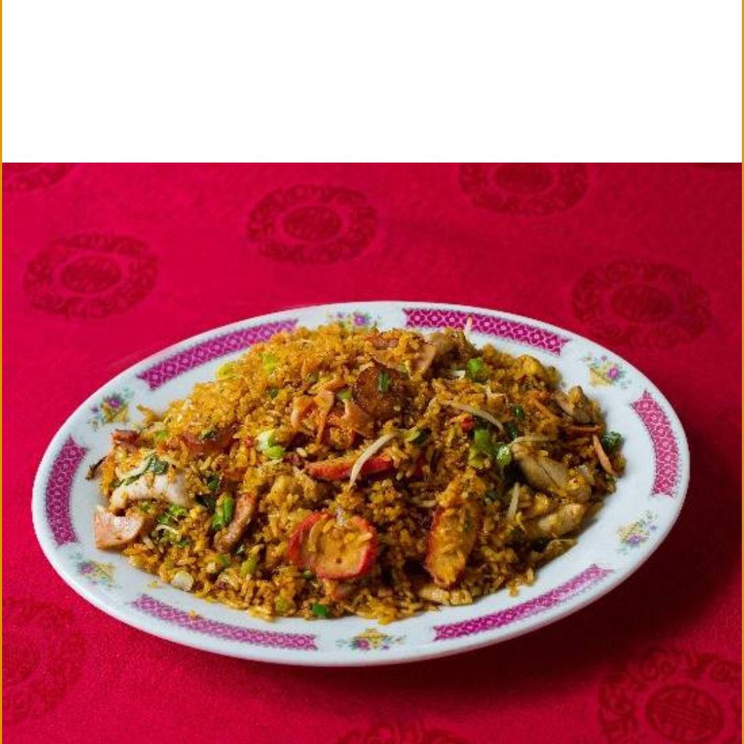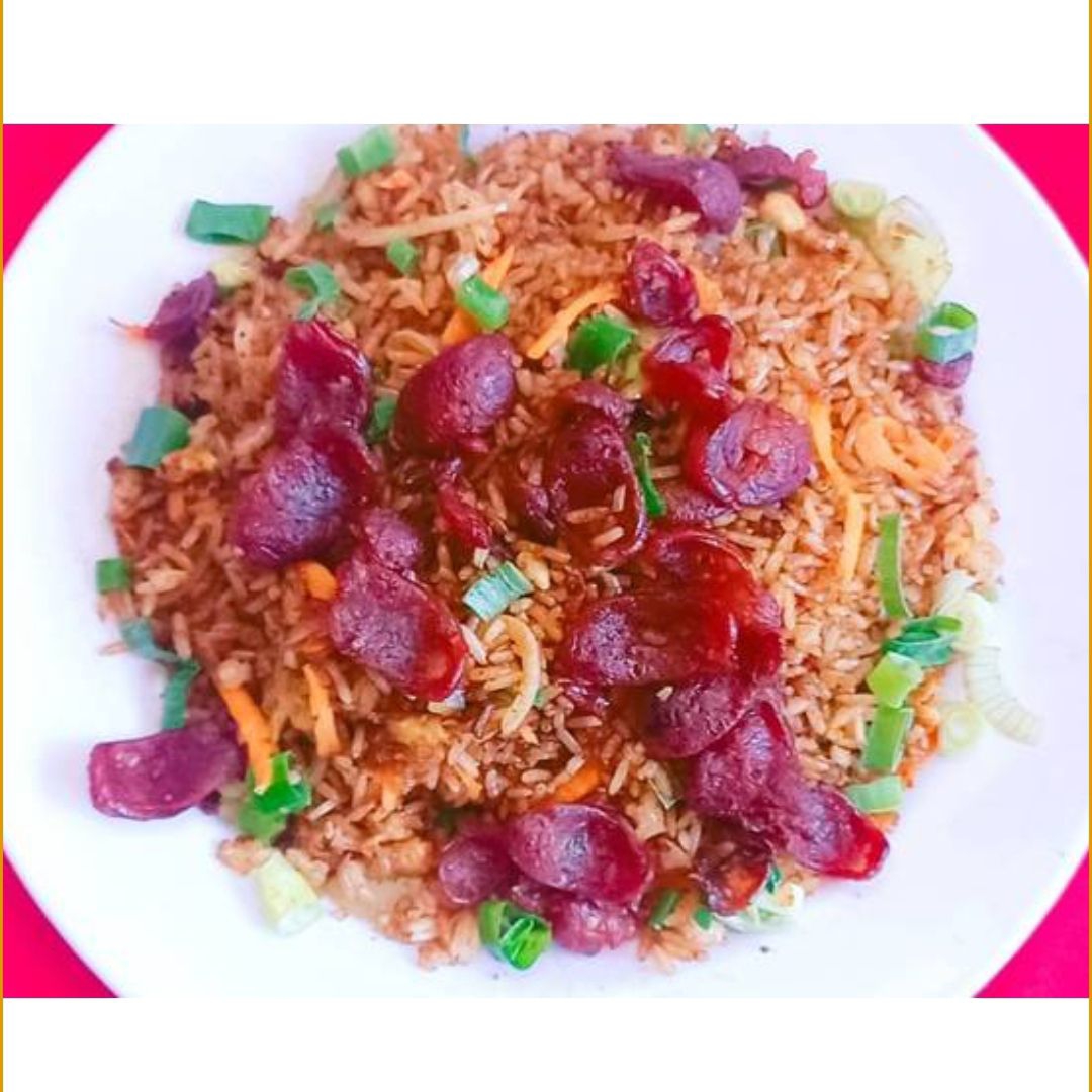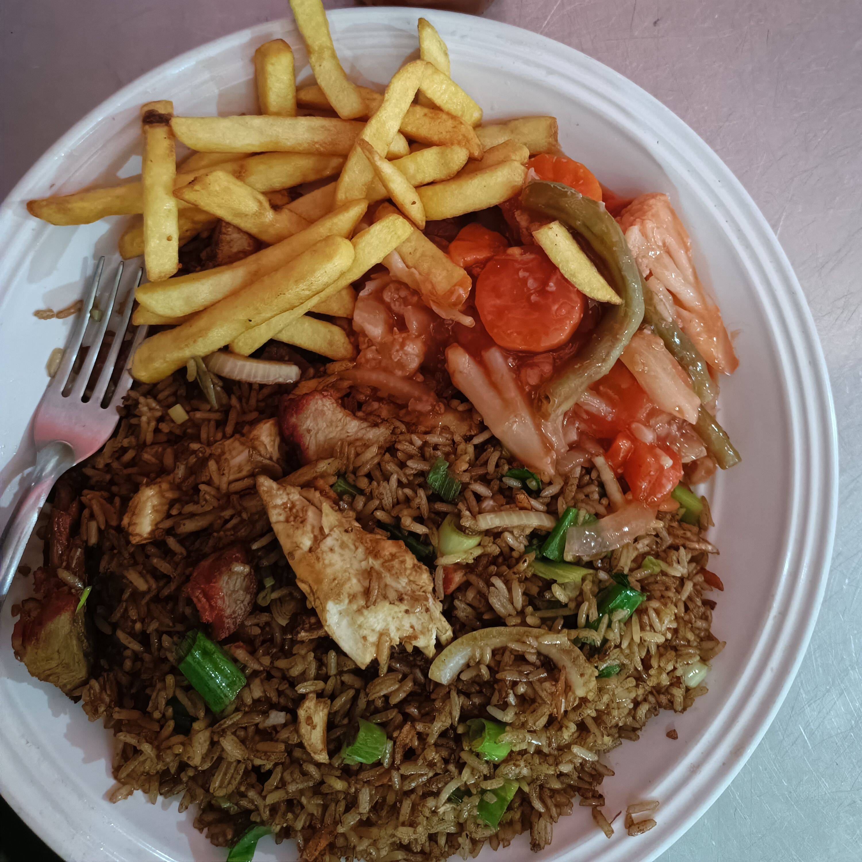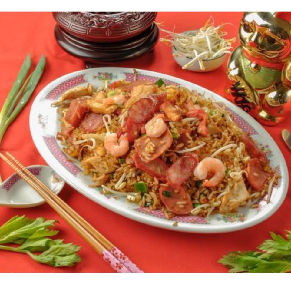Delicioso chop suey seco con vegetales, jamón, lechón, pollo y pan.