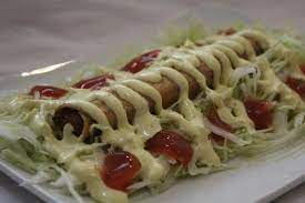 Papas fritas, salchicha frita en rodajas con queso cheddar, salsa de tomate y mayonesa.