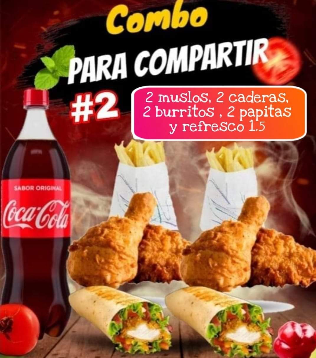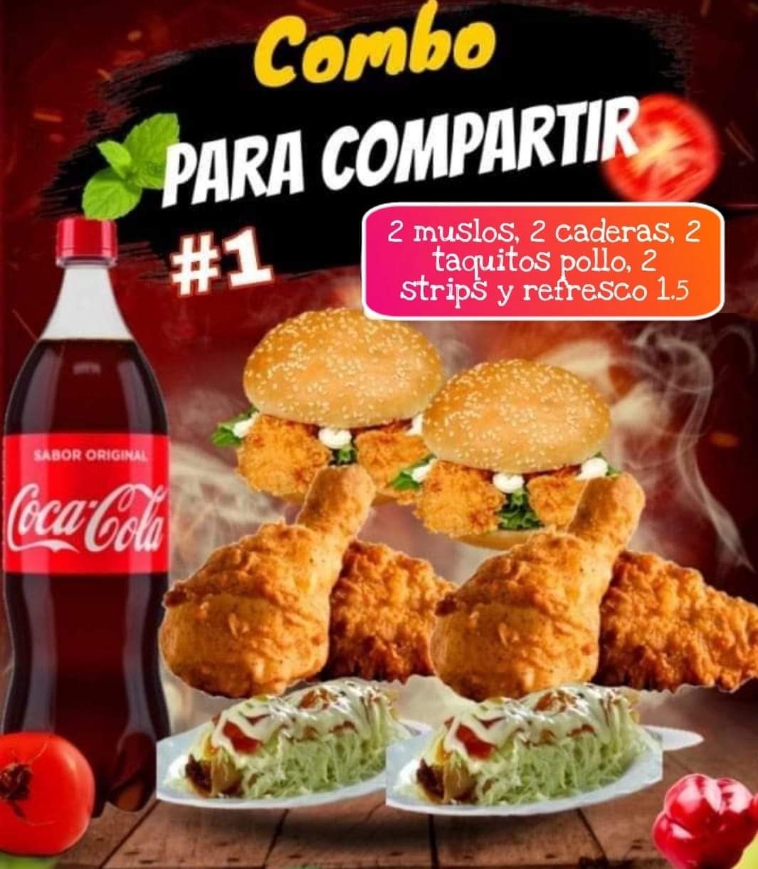 2 Porción de Muslo y Cadera + 2 Hamburguesa Strips Burger + 2 Taquito de pollo + 1 Coca Cola Regular 1.5 L