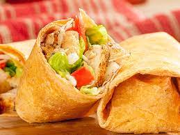 En tortilla de harina, queso cheddar, pollo mechado, lechuga, tomate y natilla.