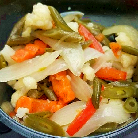 VINAGRE, ZANAHORIA, PEPINO, CEBOLLA, CHILE DULCE.