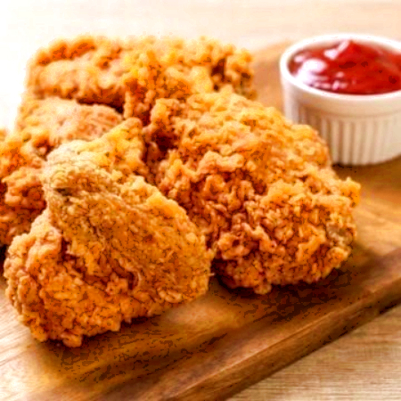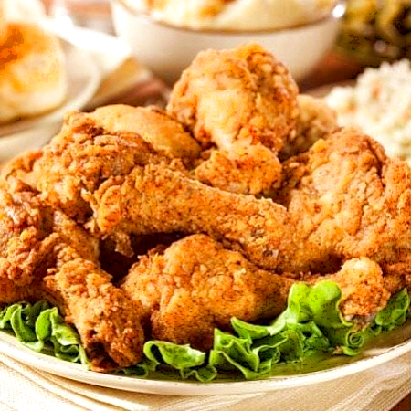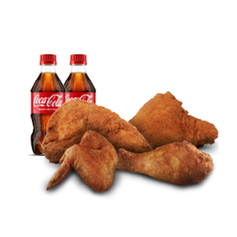 4 Piezas fritas (1 pechugas, 1 ala, 1 muslo y 1 cuarto) 2 extras a escoger: ensalada de repollo, escabeche o papas fritas), 2 refrescos de 355 ml, 4 Tortillas.