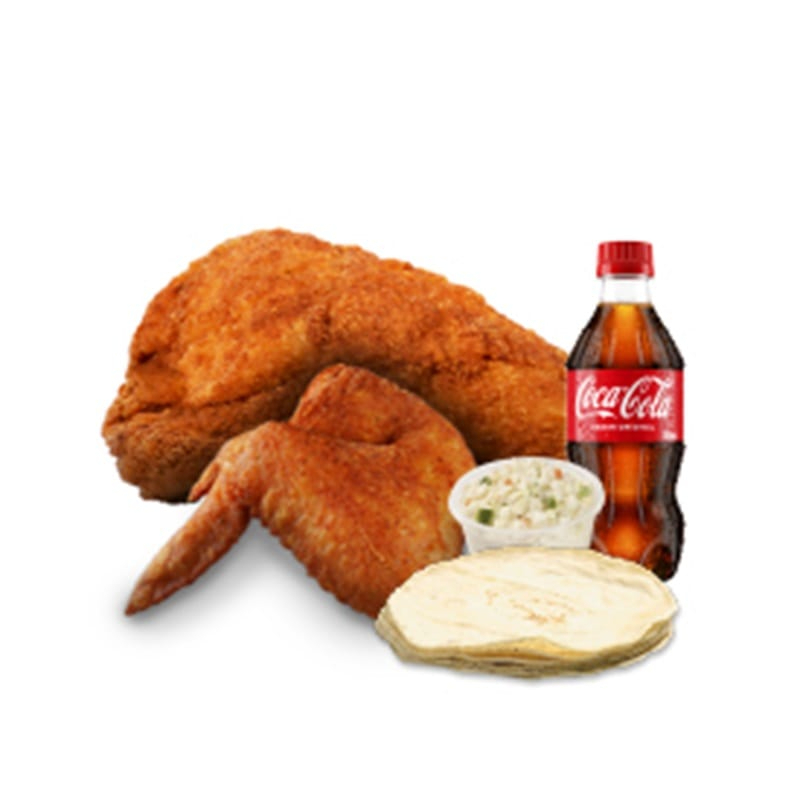 2 Piezas fritas (1 pechuga y 1 ala) 1 Extras a escoger: ensalada de repollo, escabeche o papas fritas), 1 refresco de 355 ml, 2 tortillas.