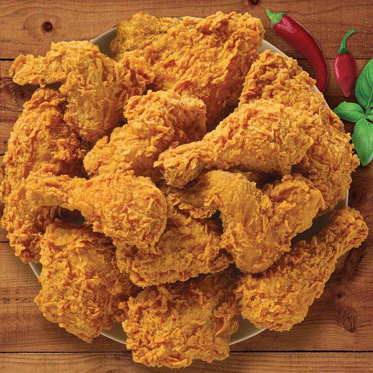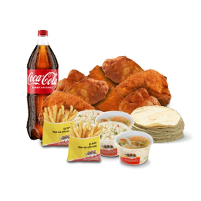 12 Piezas fritas (3 pechugas, 3 alas, 3 muslos y 3 cuartos) 6 extras a escoger: ensalada de repollo, escabeche o papas fritas, 1 Coca-Cola 1.5 L. y 12 tortillas.