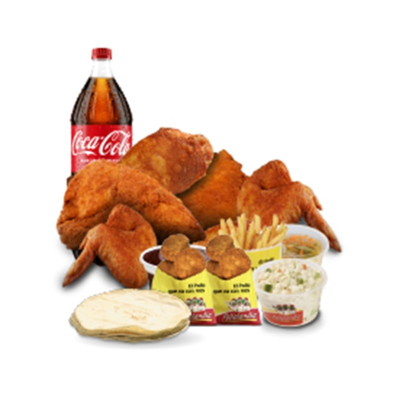 6 Piezas fritas (1 pechugas, 1 ala, 2 muslo y 2 cuarto) 4 extras a escoger: ensalada de repollo, escabeche o papas fritas), 10 medallones, 1 salsa BBQ (3oz), 1 refresco de 1.5 litros Coca Cola, 6 tortillas.