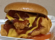 Deliciosa Hamburguesa con Pechuga de Pollo, Pepinillos, Tocineta, Queso Cheddar, Salsas, bañada en salsa a elegir + 150gr de Papas Fritas