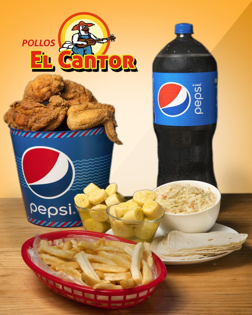 12 Piezas de pollo combinadas , 2 ordenes de papas, un refresco grande 2 litros, una orden de chile y un paquete de tortillas.