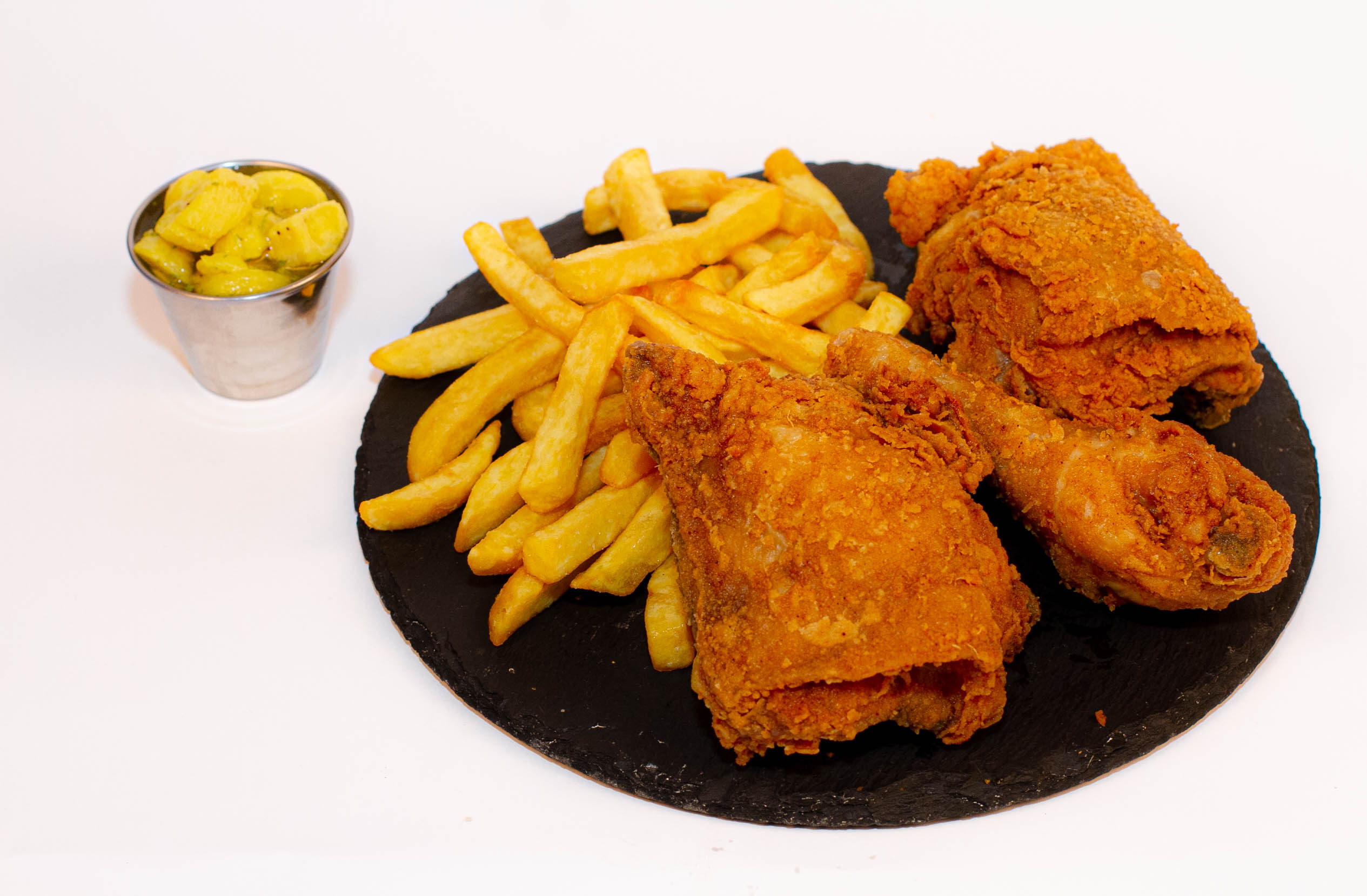 2 Piezas de muslo y cuarto, acompañado de platanito ó tortillas.