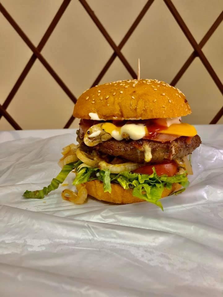 Pan de hamburguesa, torta de carne mas lechuga mas tomate.