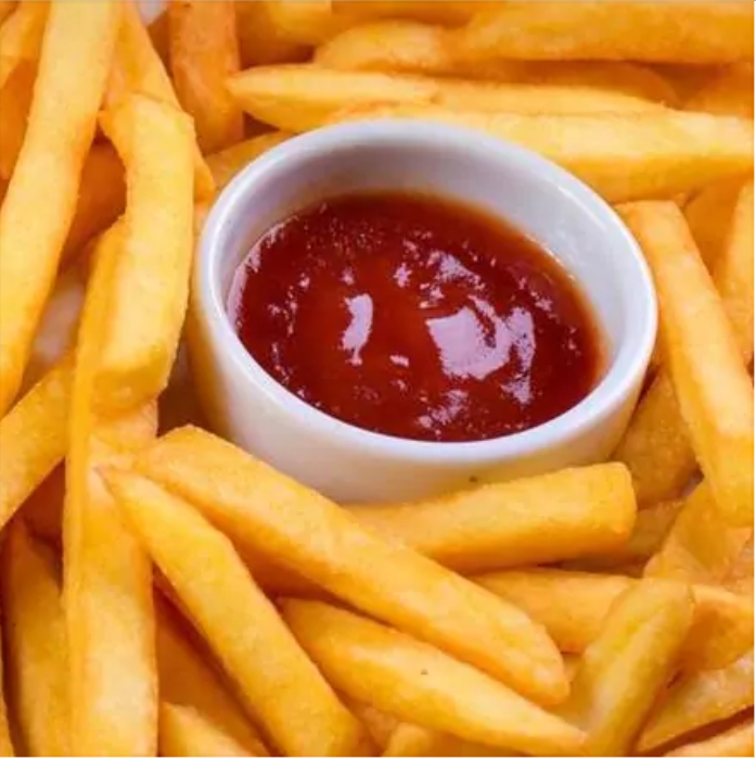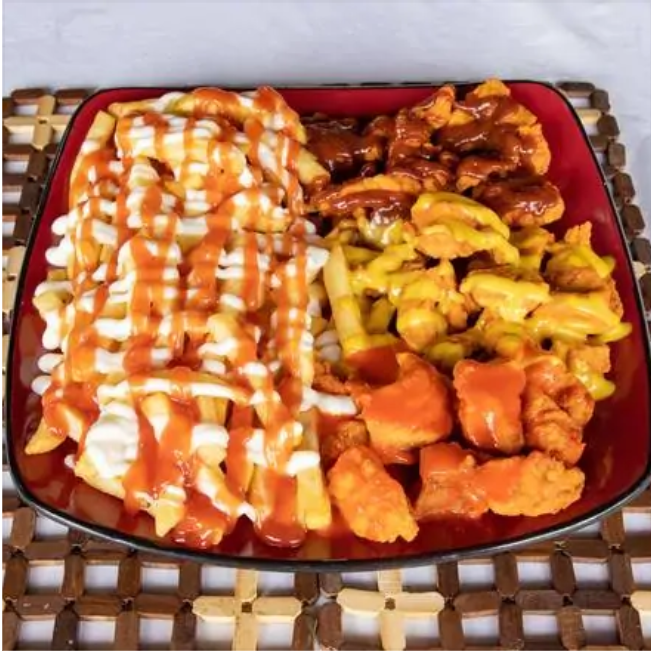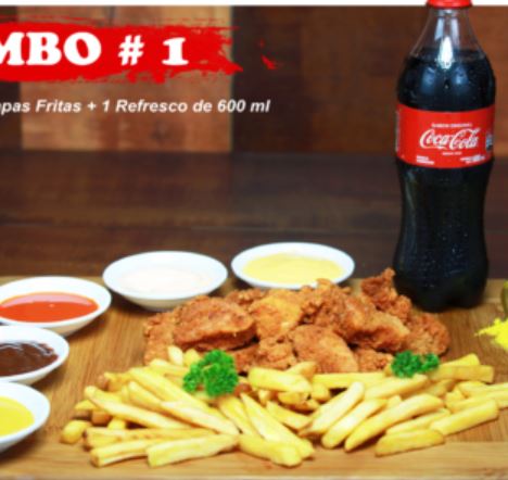 Trozas de filet de pechuga, bañados en tu salsa preferida, acompañado de papas fritas!