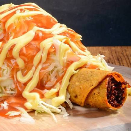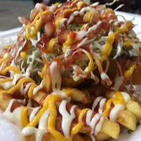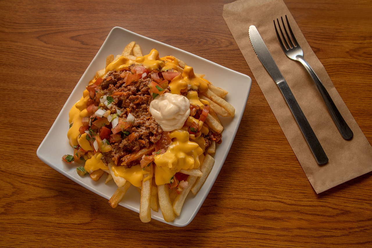 Papas fritas grandes, carne molida, queso cheddar, pico de gallo y natilla