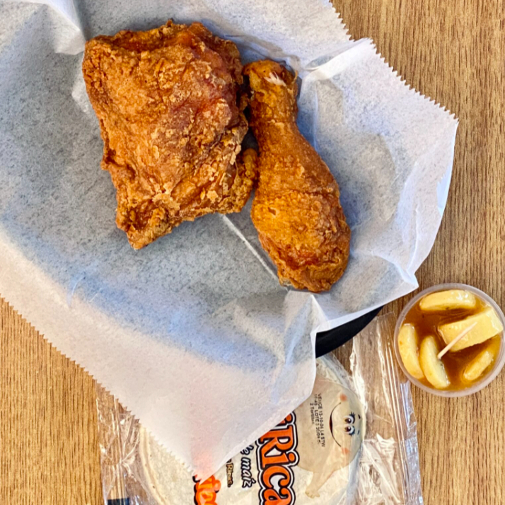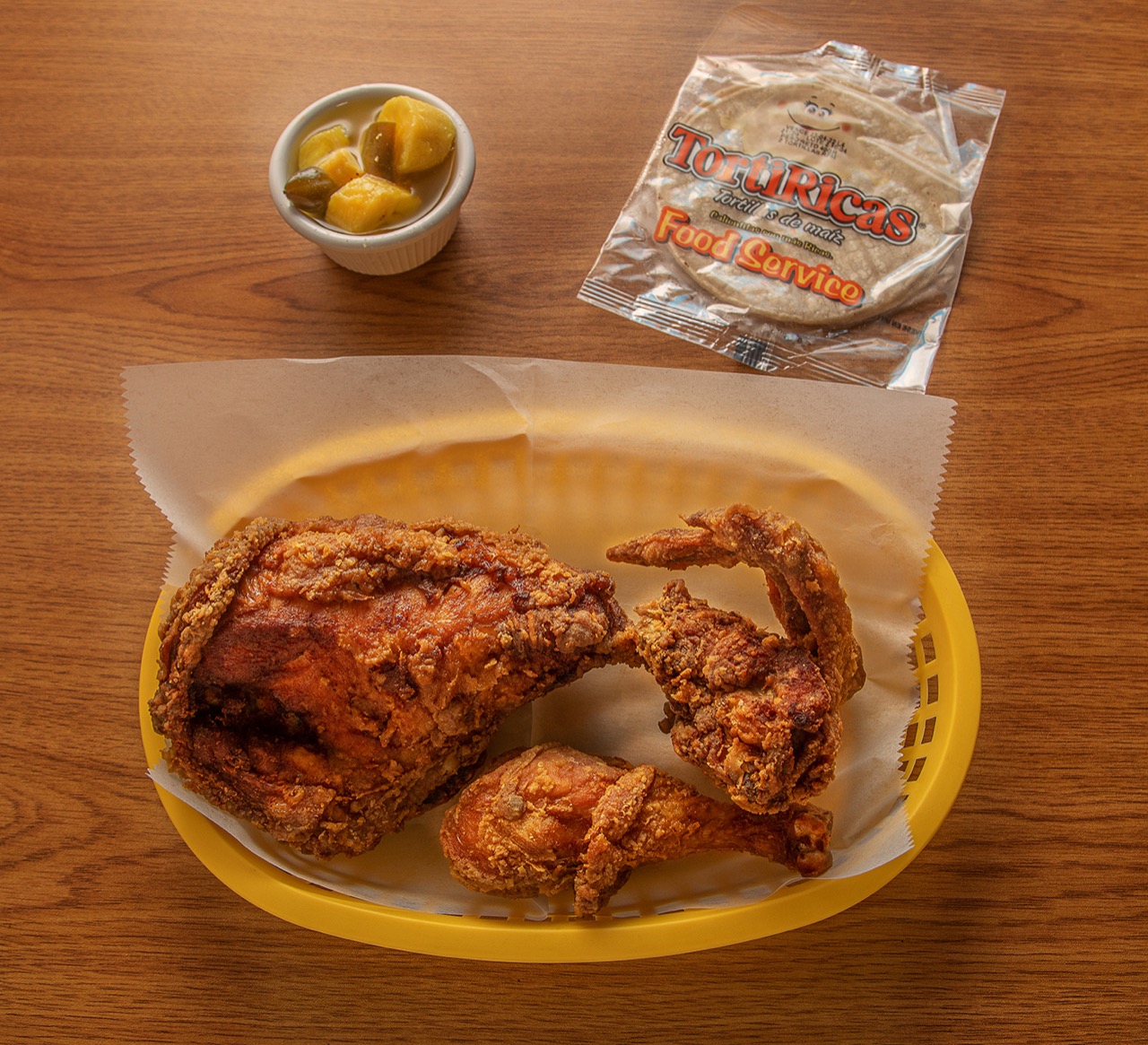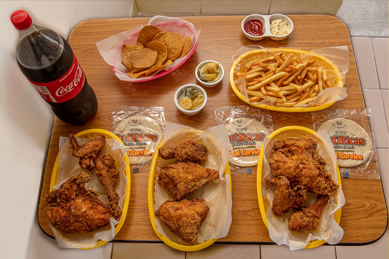 1 cadera, 1 muslo, chile jalapeño, tortillas, papas pequeñas y gaseosa 355 ml.