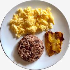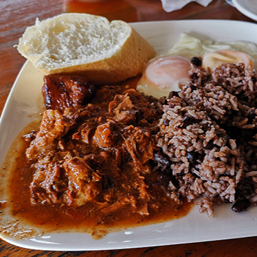 Pinto, carne en salsa, 2 huevos, pan y maduro