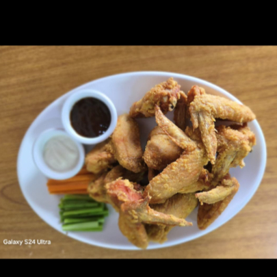 10 piezas enteras ,apio, zanahoria y dos salsas al gusto