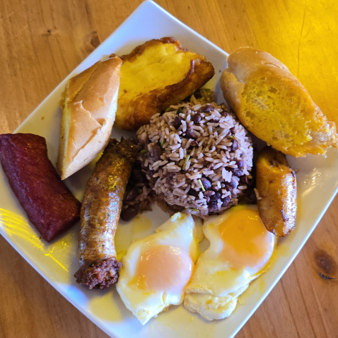 Pinto, queso, salchichón, chorizo, huevo, pan y maduro