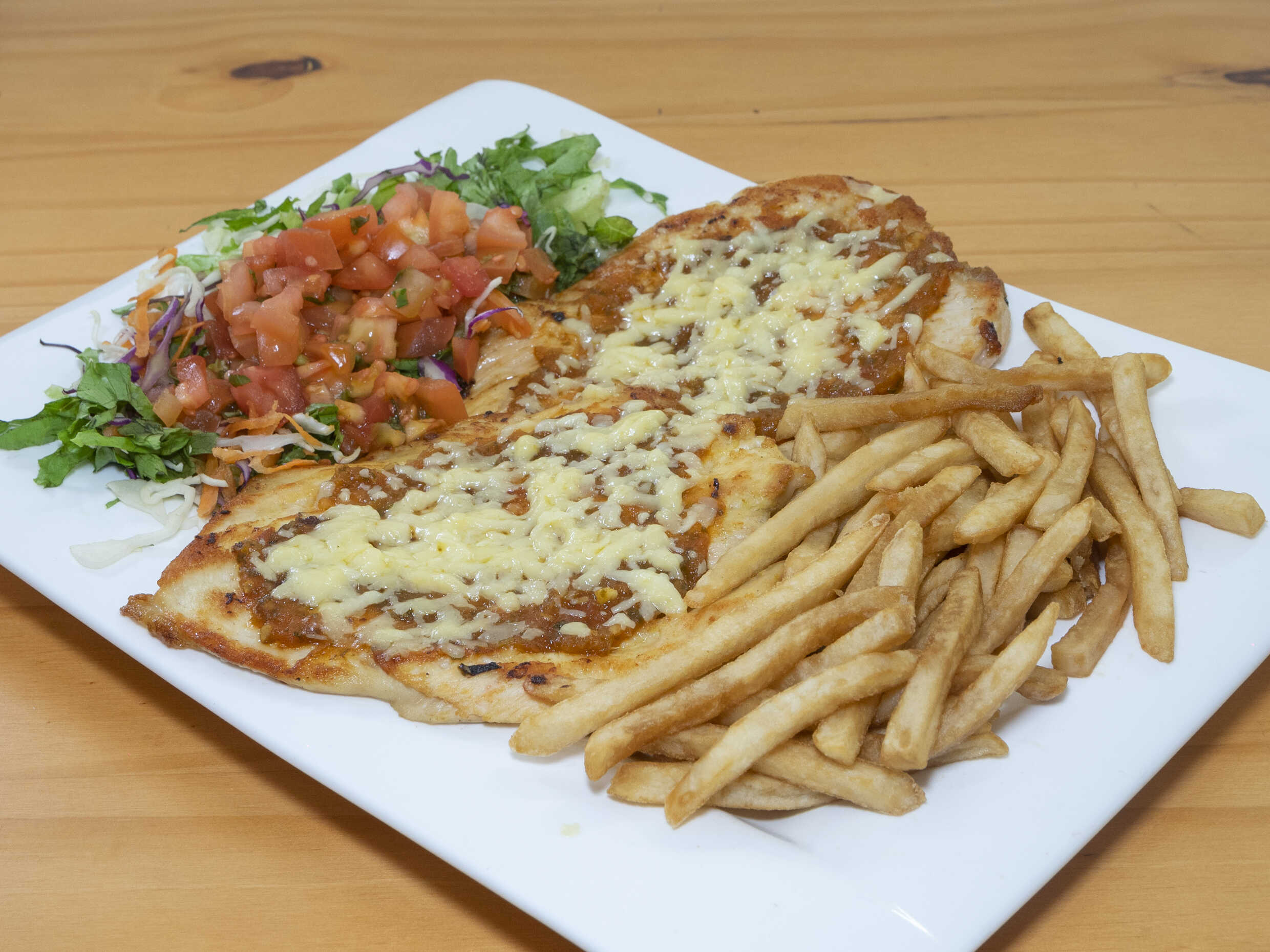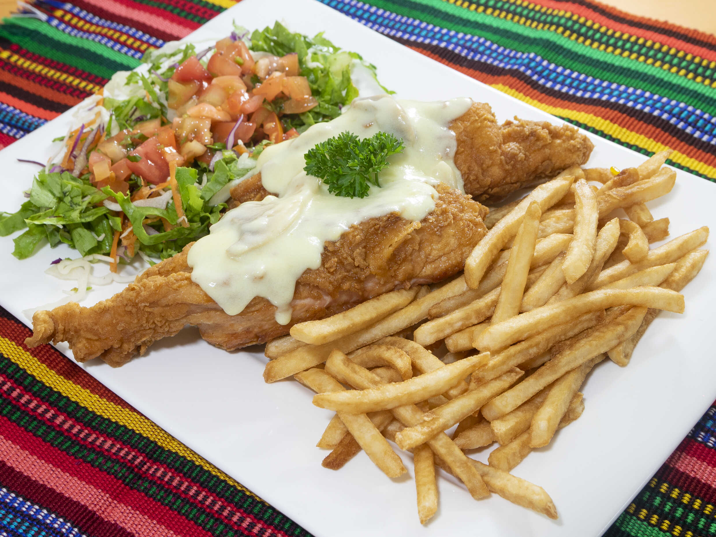 Pechuga rellena de jamon y queso mozarella, bañada de salsa blanca, acompañada de papas fritas y ensalada verde de lechuga y tomate.
