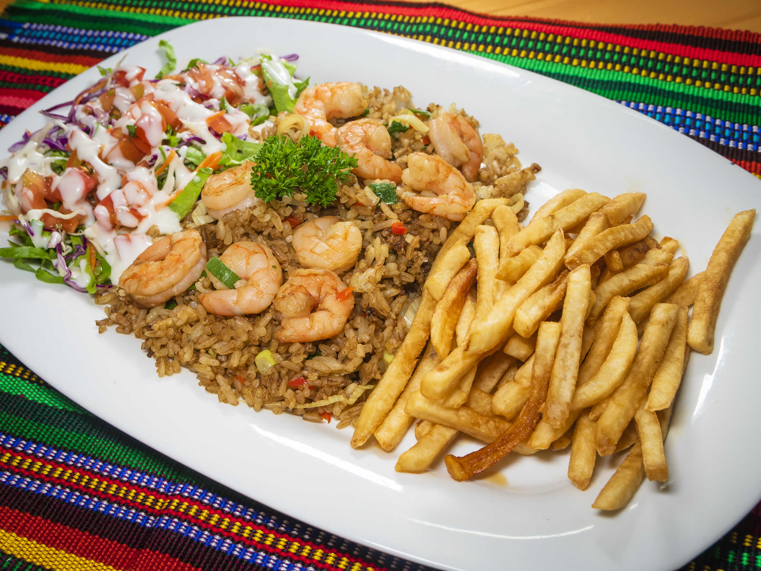 Delicioso arroz con camarones acompañado de papas y ensalada probalo ya.
