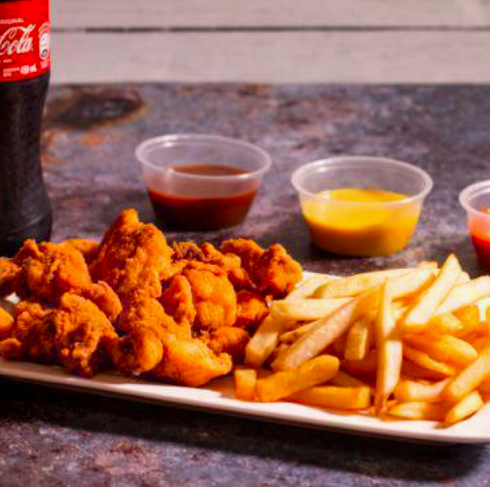 Deliciosos trozos de pechuga de pollo empanizados, la orden incluye los nuggets de pollo y una salsa a elegir BBQ, Búfalo o Mostaza miel.