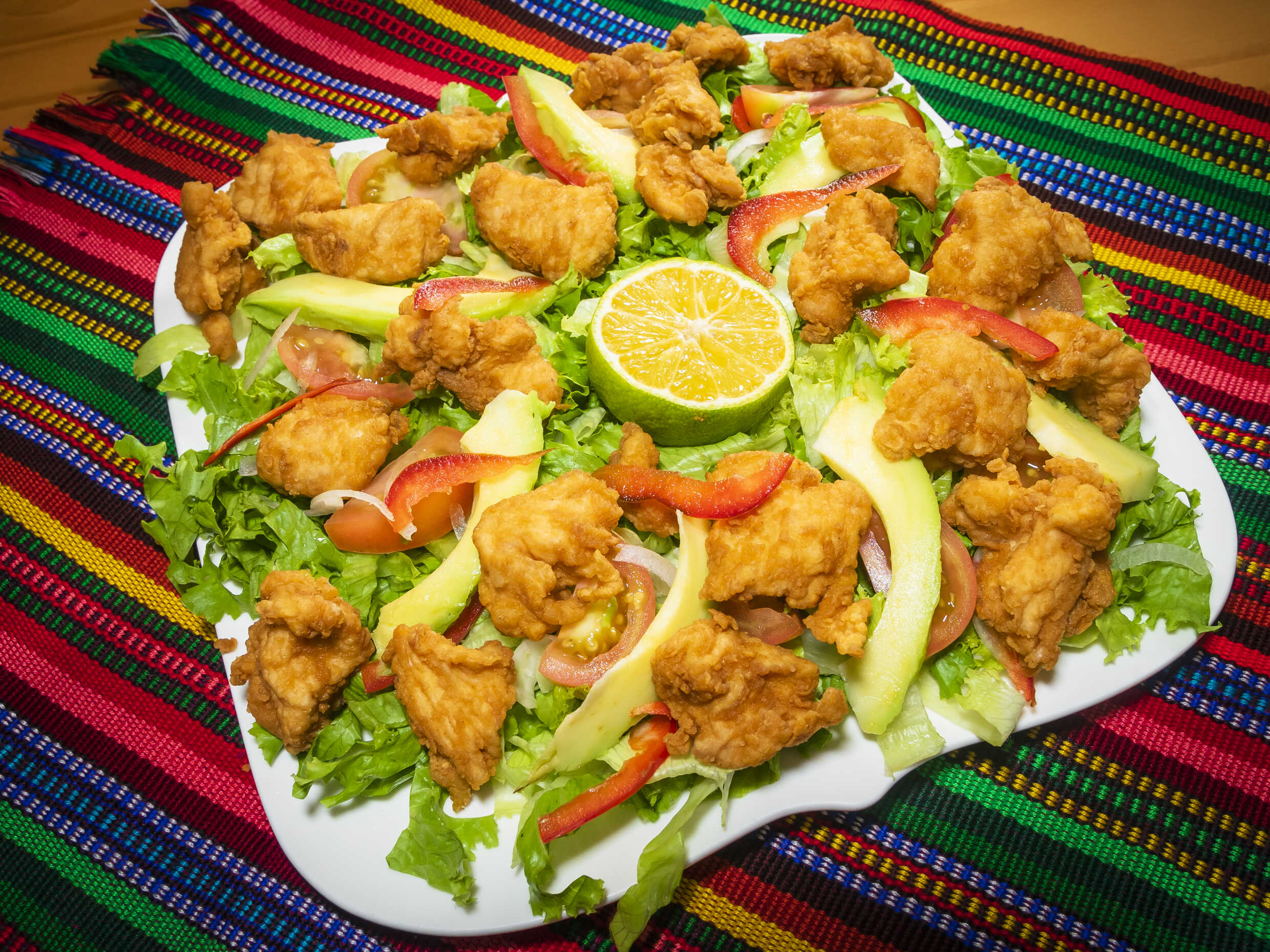 Una cama de lechuga, gajos de Aguacate, Tomate, Chile dulce y nuggets de pollo, aderezo a elegir.