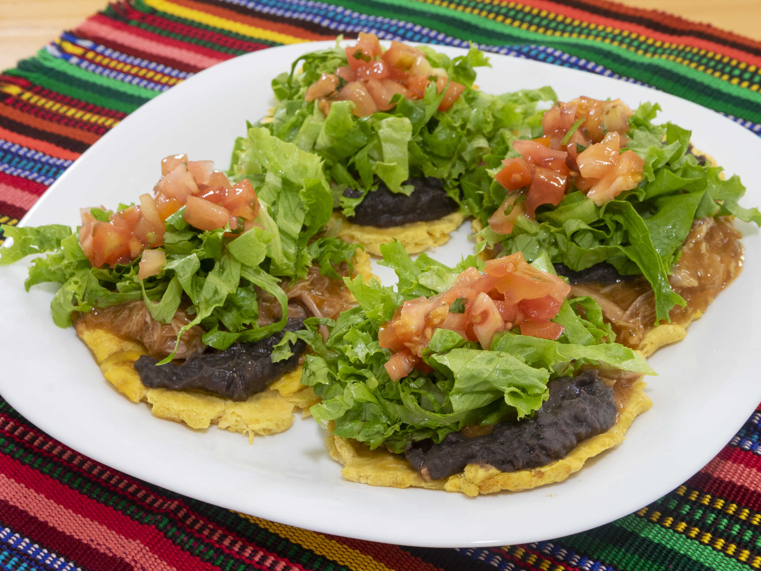 Tortilla grande tostada con frijoles molidos, salsa de queso, lechuga y chimichurri.