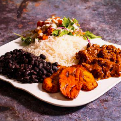 Arroz, frijoles, plátano maduro, elige tu proteína preferida, ensalada verde de lechuga y tomate.(personal).