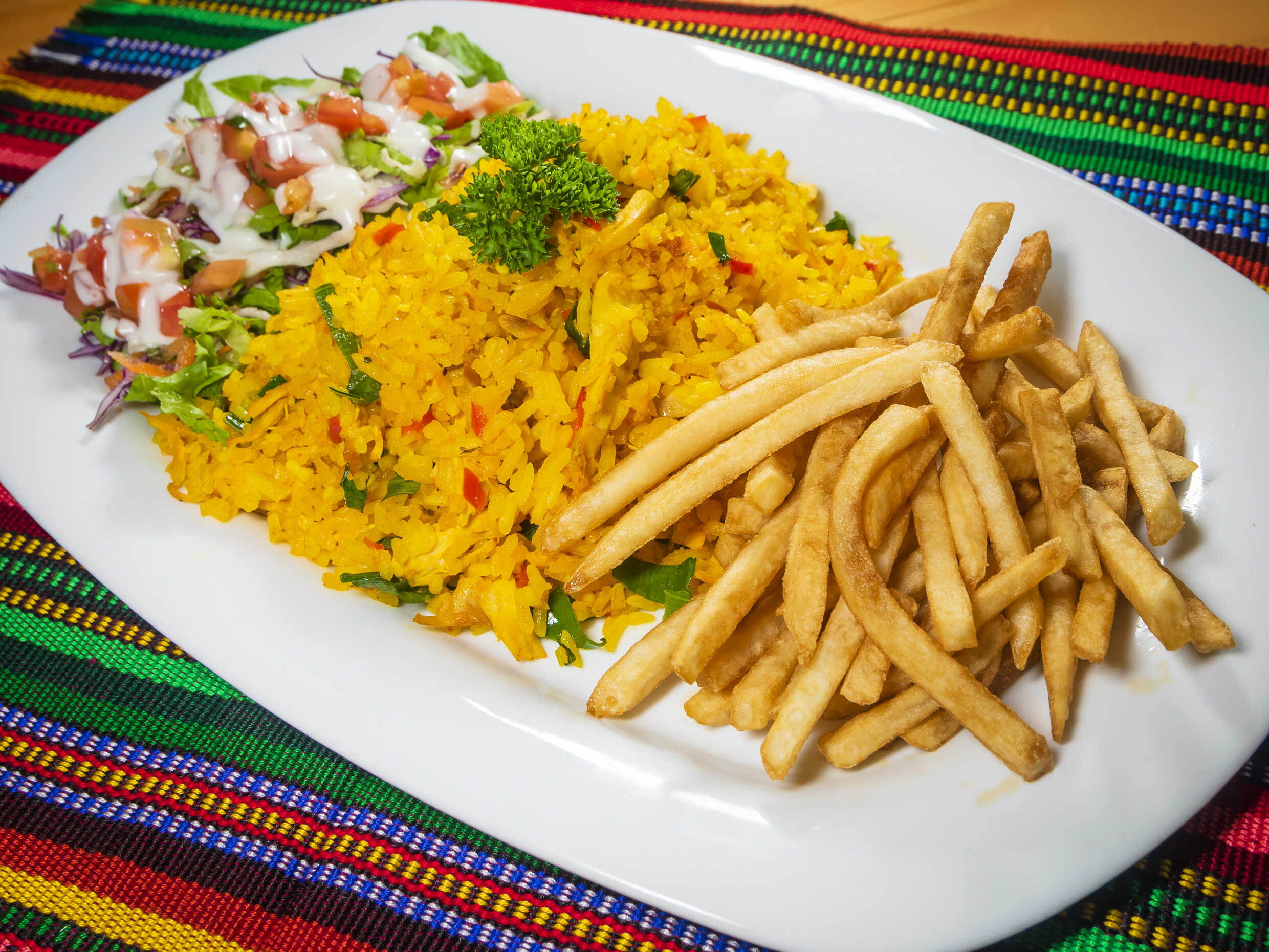 Nuestro arroz con pollo es de receta casera con sabor a hogar acompañado de papas y ensalada no te lo podés perder.