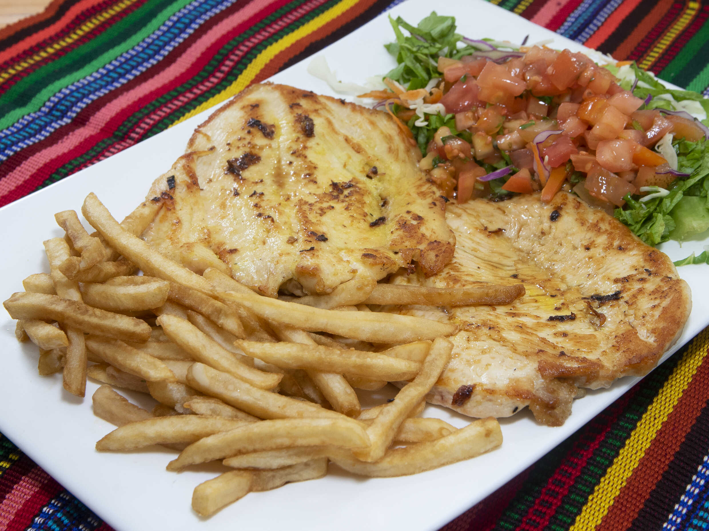 El plato lleva dos filetes de pollo a la plancha, acompañado de papas y ensalada.