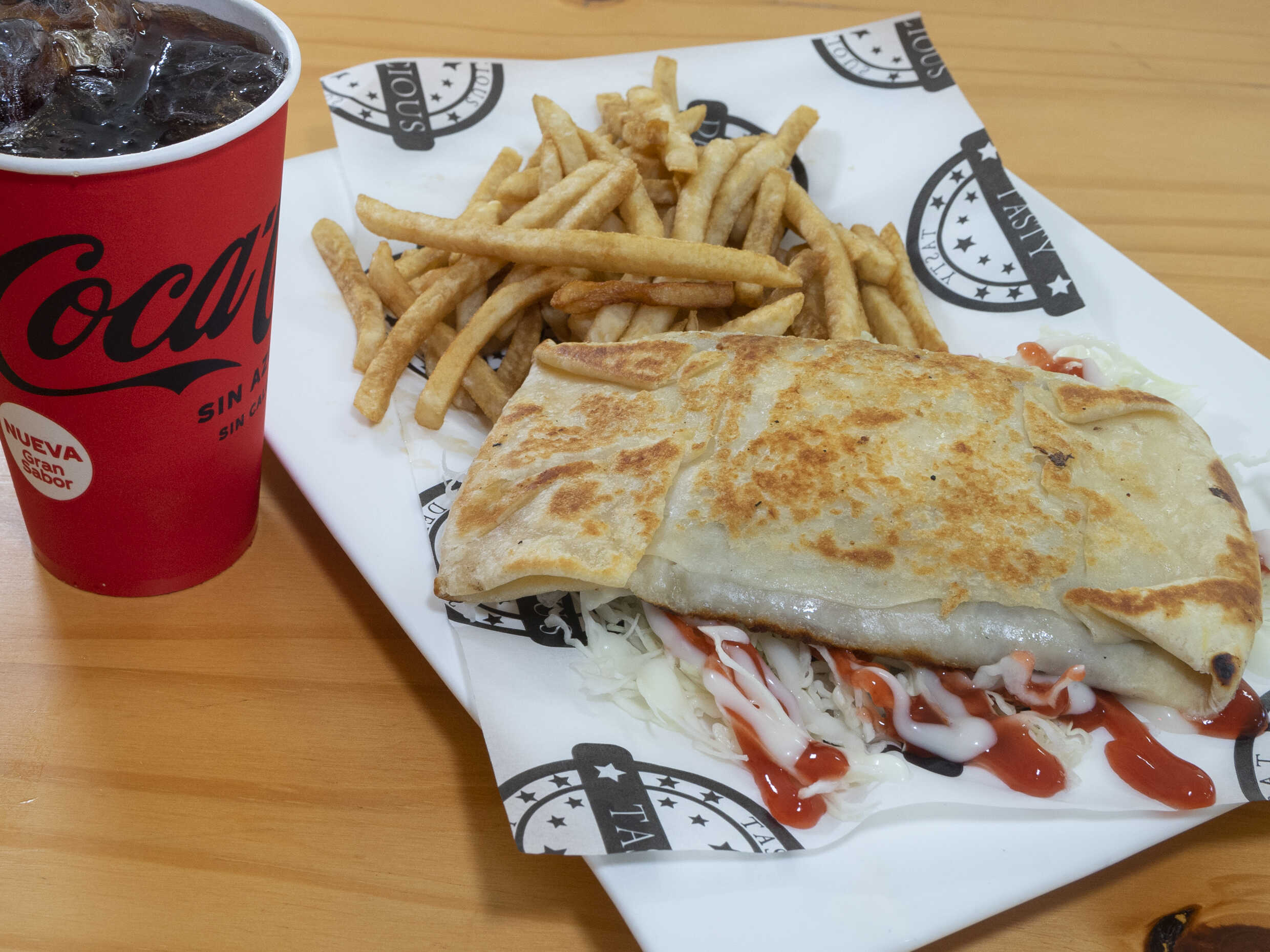 Tortilla suave de harina, rellena de frijoles molidos, carne de res y salsa queso. Las papas y el refresco lo puedes pedir con un costo adicional.