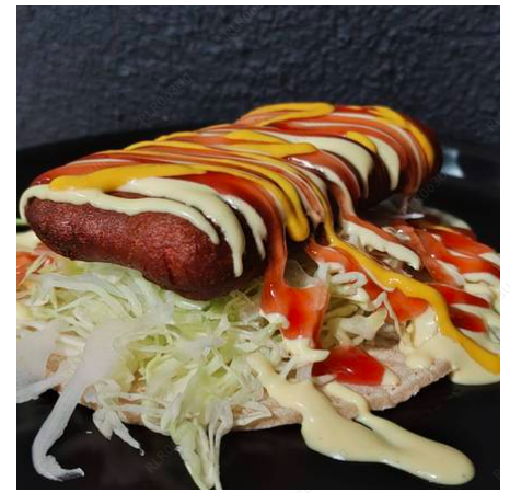 Pan de hot dog, salchicha, repollo, salsa de tomate y mayonesa artesanal.