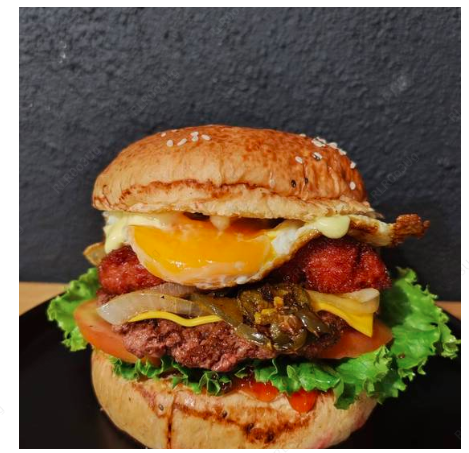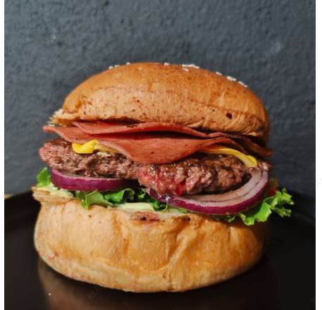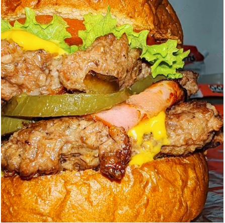 Pan artesanal, torta de carne 125 g, 2 lonjas de jamón, queso americano, pepinillos, lechuga, tomate, cebolla, salsa de tomate y mayonesa artesanal.