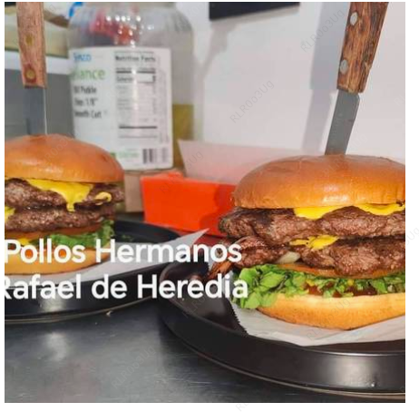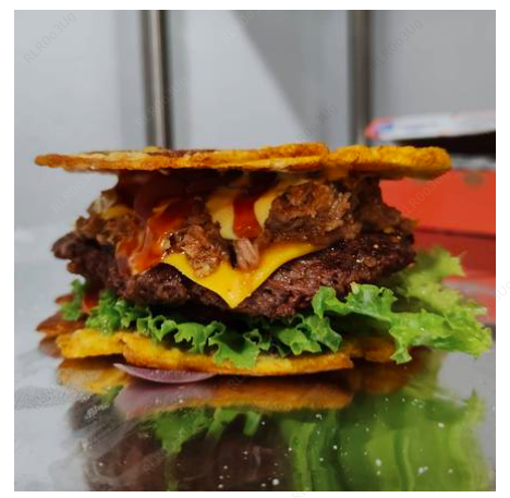 Dos patacones, torta de 125 g, queso amarillo, carne mechada, lechuga, tomate, cebolla morada, salsa de tomate y mayonesa.