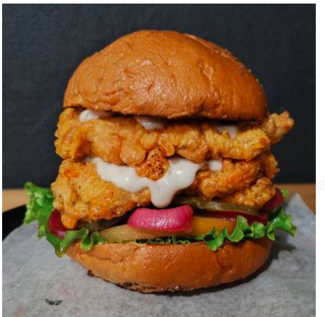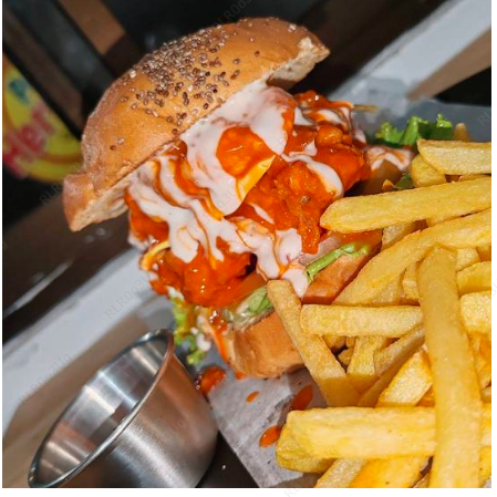 Pan artesanal, 2 filetes de pechuga de pollo empanizados de la casa bañados en salsa búfalo, queso americano, lechuga, tomate, cebolla morada y salsa ranch.