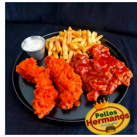 4 Dedos de pollo grandes 100% pechuga con empanizado especial de la casa acompañado de papas y salsa a elegir.
