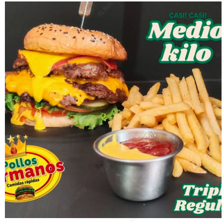 Pan artesanal, 3 tortas de 125 g, triple queso amarillo, triple jamón, lechuga, tomate, cebolla morada, pepinillos, salsa de tomate, mayonesa y mostaza.