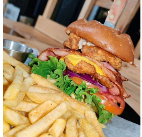 Pan artesanal, 2 filetes de pechuga de pollo empanizados de la casa, tocineta, queso americano, lechuga, tomate, cebolla y salsa chipotle de la casa.
