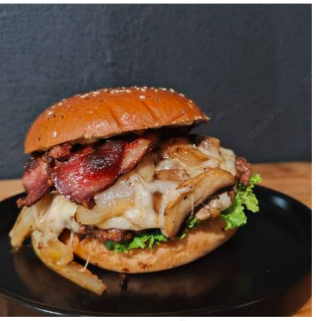 Pan artesanal, torta de 150 g, queso mozzarella fundido con hongos y cebolla caramelizada, tocineta, lechuga y mayonesa artesanal.