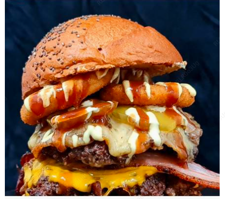 Pan artesanal, torta de carne 125 g, queso americano, tocineta, aros de cebolla, lechuga, tomate, salsa BBQ y mayonesa artesanal.
