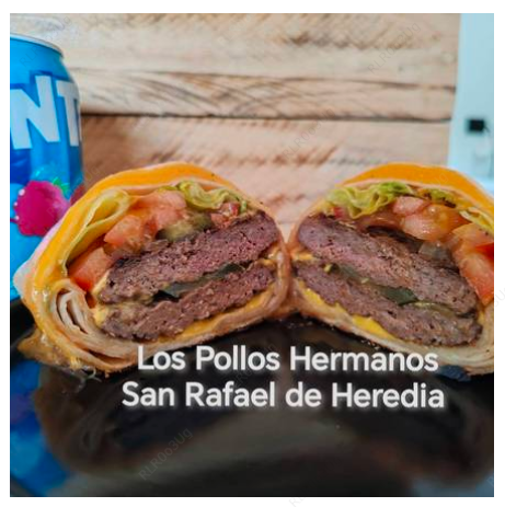 Tortilla de harina, 2 tortas de carne, queso americano, cebolla cocinada, jalapeños, pepinillos, lechuga, tomate, salsa de queso y salsas de tomate y mayonesa artesanal.