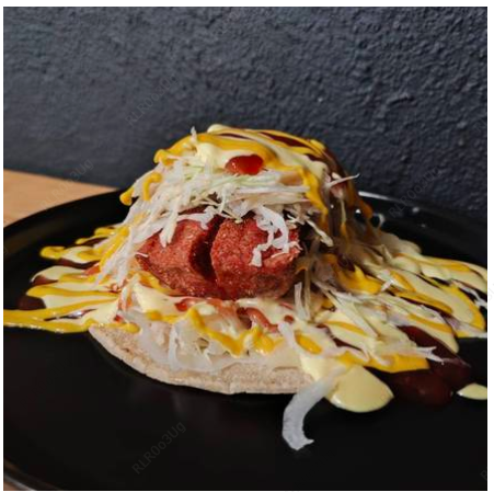 Tortilla, torta de carne, repollo, salsa de tomate y mayonesa artesanal.